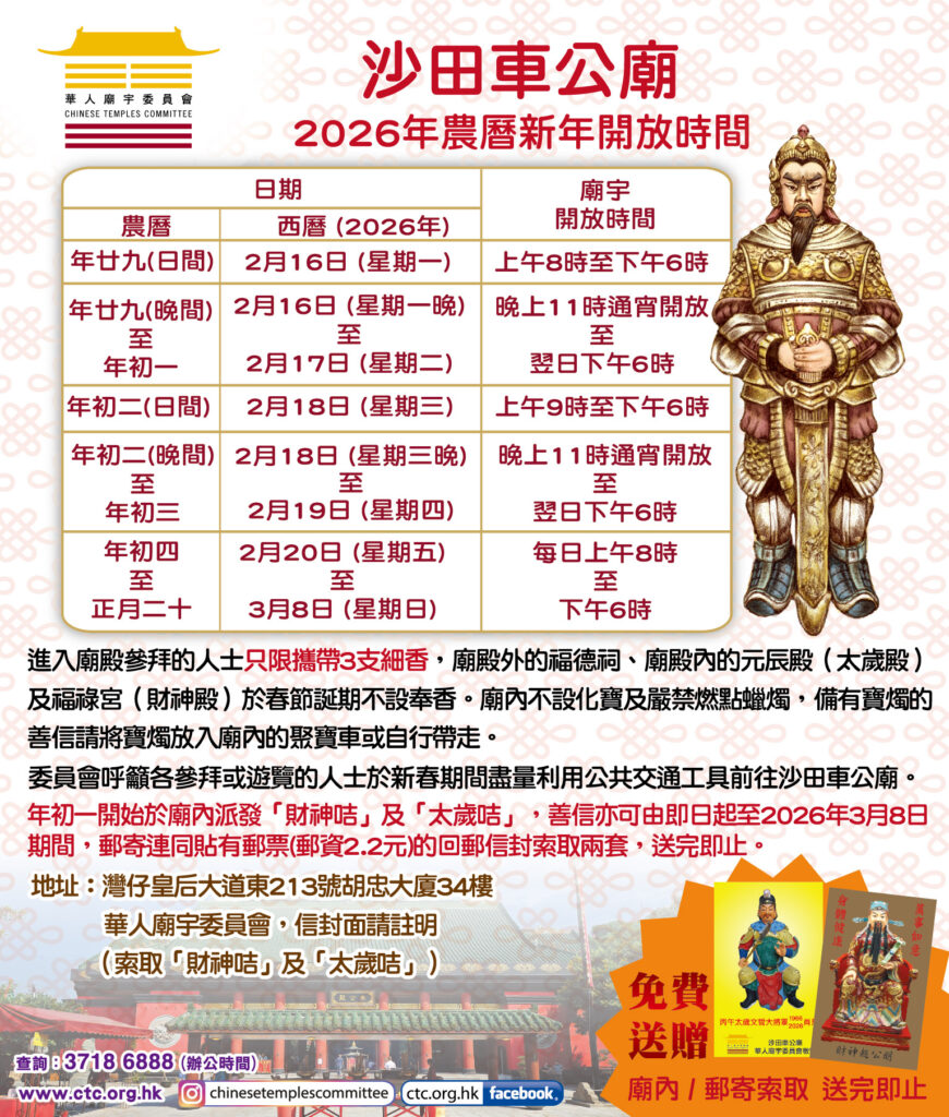 大公文匯全媒體報道,今日(2月18日)是大年初二「車公誕」,農曆新年參拜沙田車公廟是香港傳統習俗,不少善信都會到車公廟拜神、求籤、祈福轉運,並且擊打天鼓,向車公「報到」。