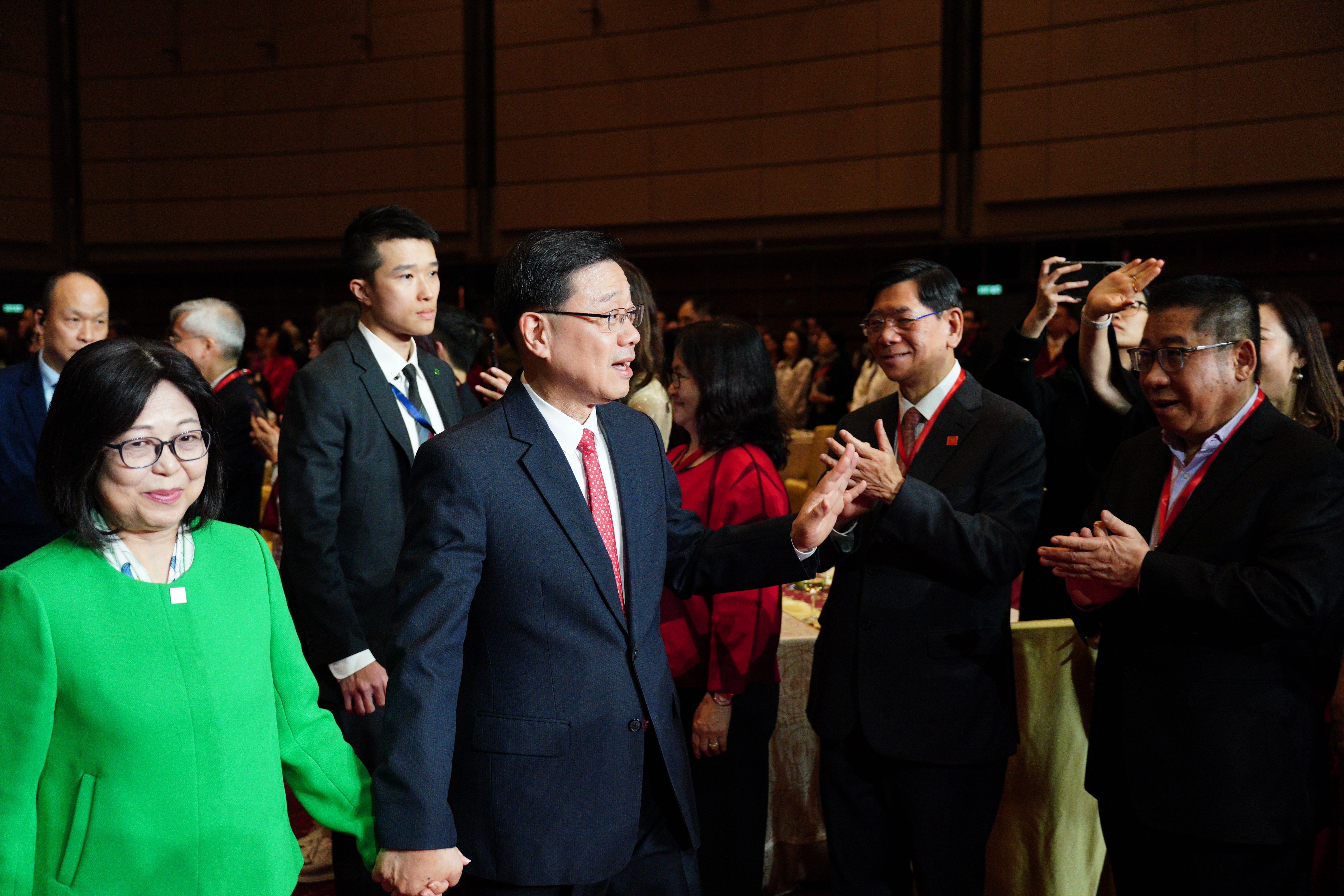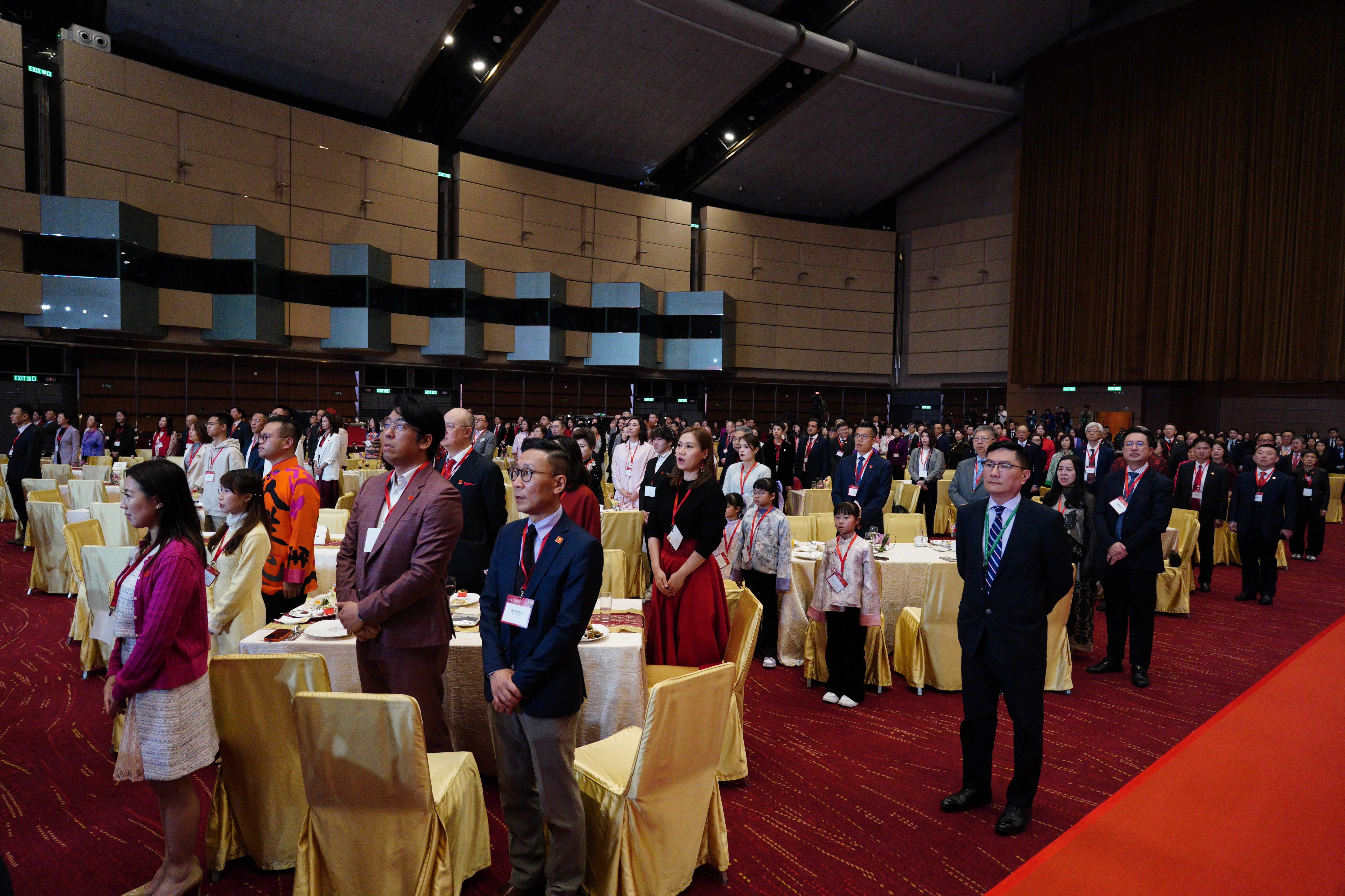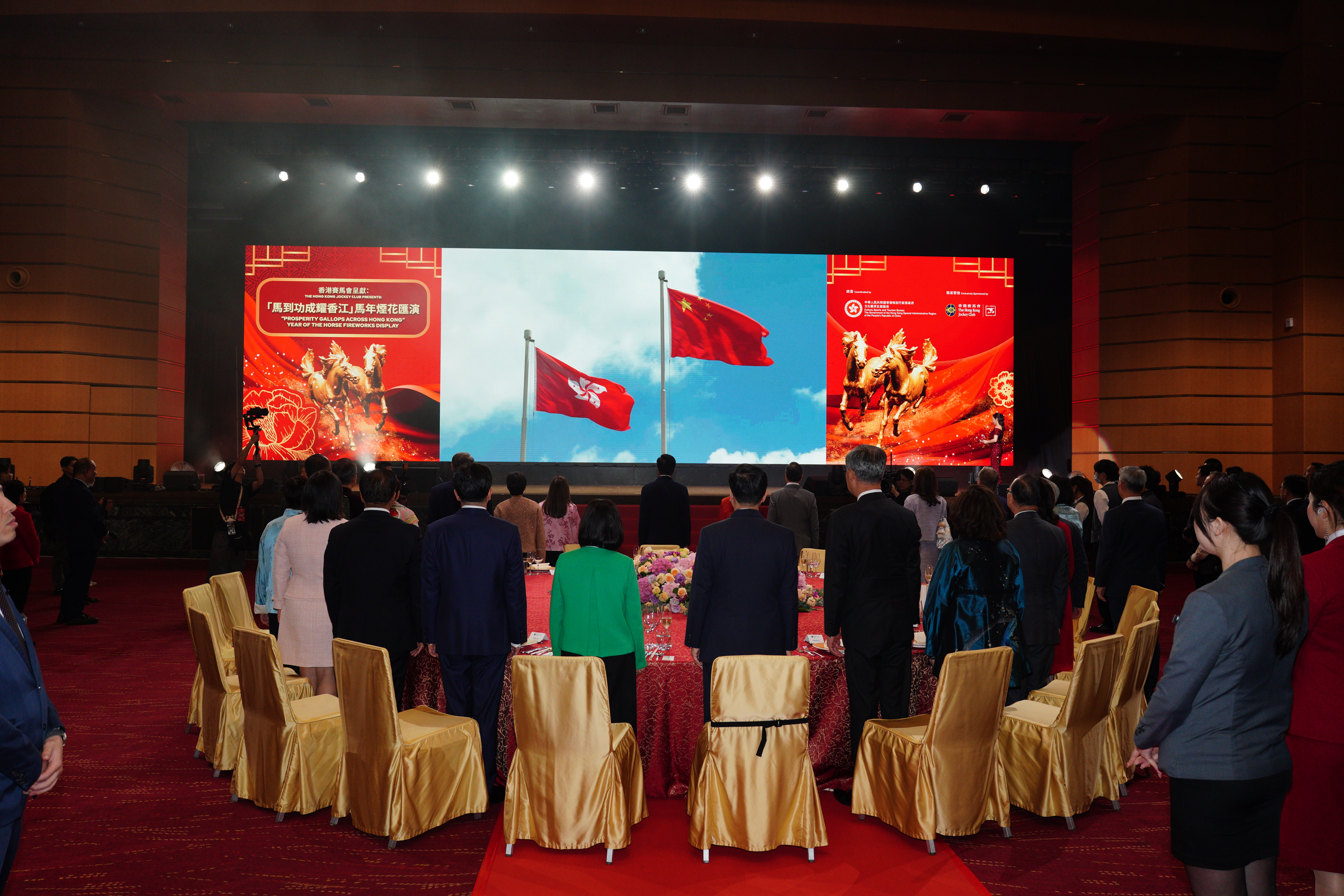 一眾嘉賓在匯演開始前於會展中心參與揭幕儀式。行政長官李家超致辭表示,今年是國家「十五五」規劃開局之年,香港會「馬不停蹄,改革求進」,主動對接「十五五」規劃,積極融入國家發展大局,繼續發揮香港「一國兩制」下背靠祖國、聯通世界的獨特優勢,為國家高質量發展貢獻香港力量。他還向大家拜年,「祝願馬年家家興旺,人人一馬當先、駿馬昂首、辭舊迎新」。
