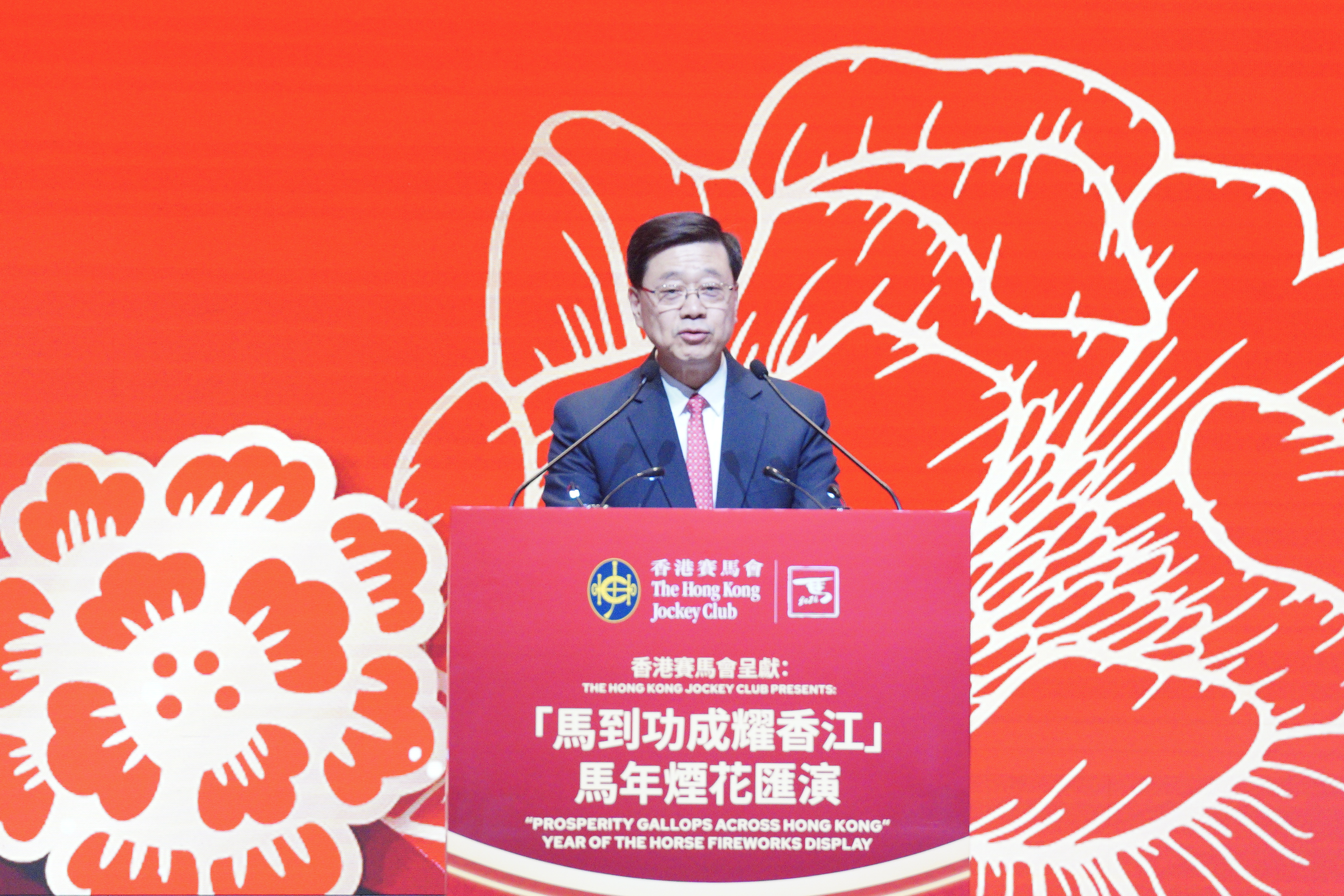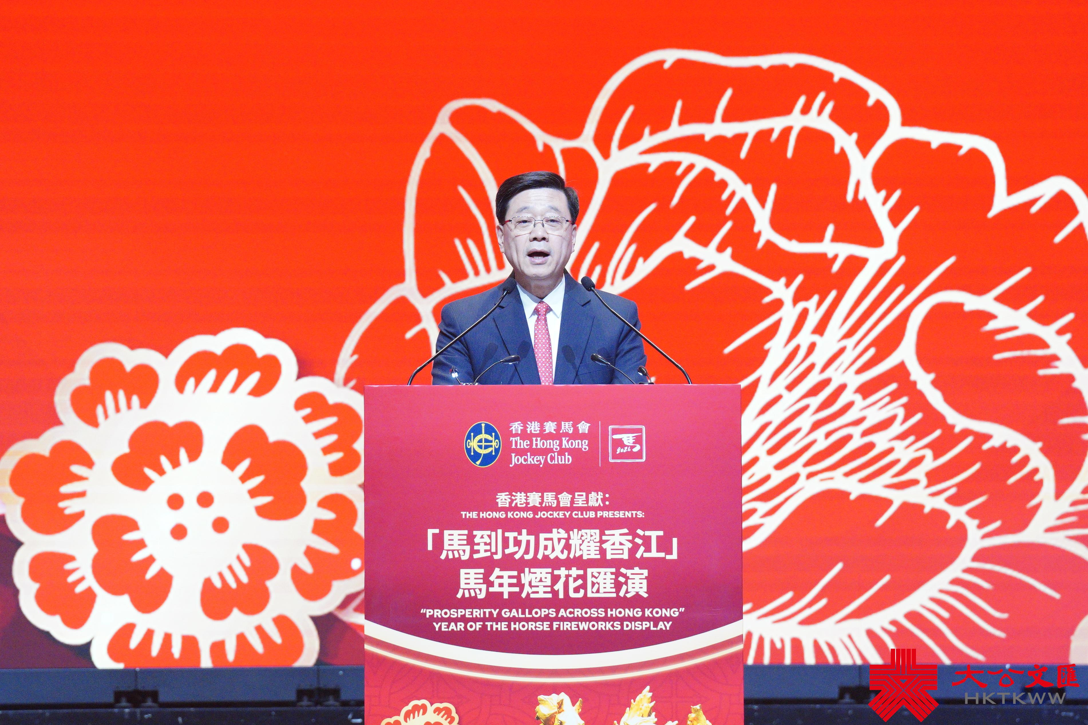 李家超指出,今晚維港兩岸有數以十萬計的市民和旅客觀賞煙花匯演,感謝香港賽馬會是次贊助,「讓我哋同心協力,為香港嘅繁榮穩定全力奮進,共同開創更美好嘅未來。」