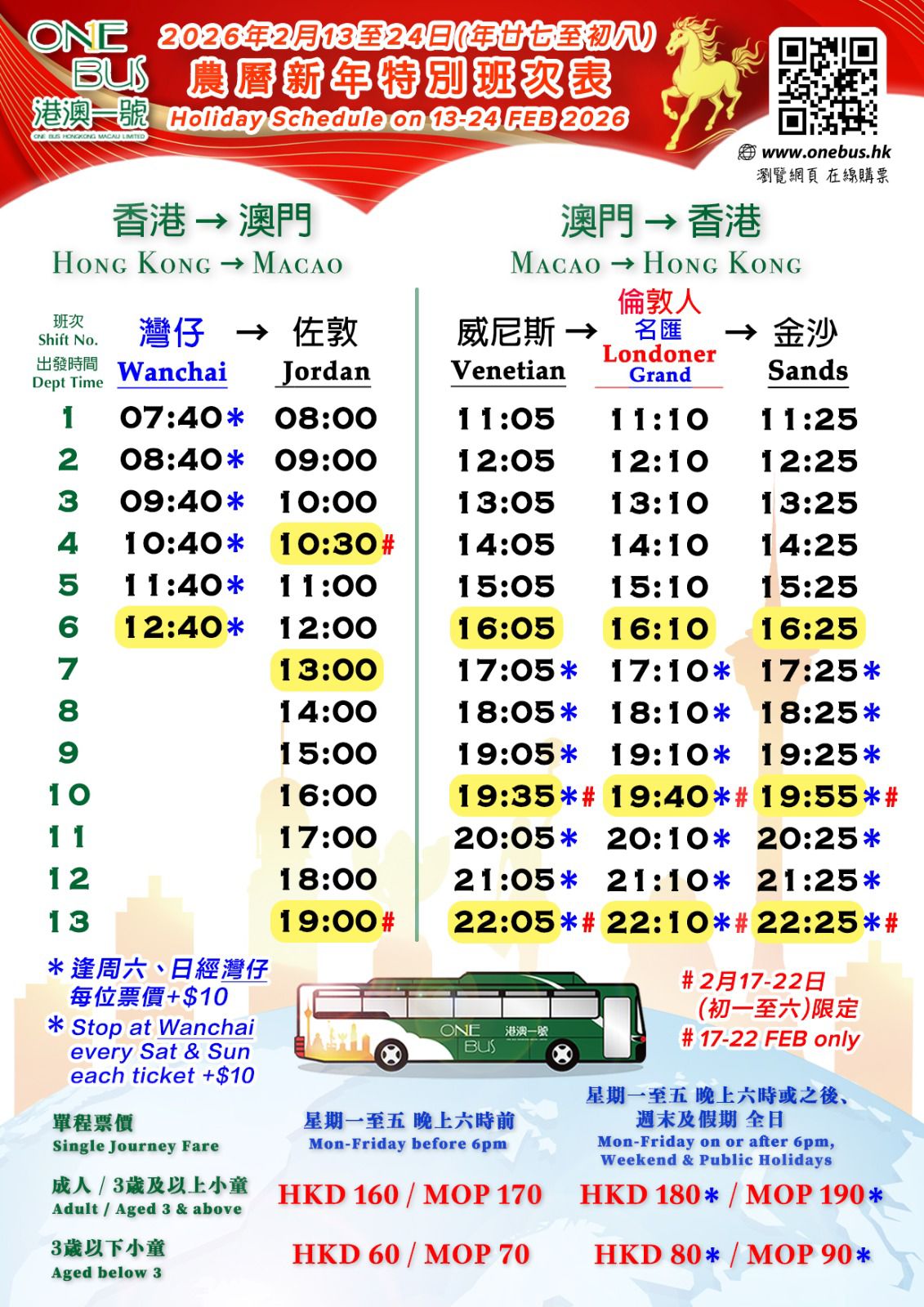 大公文匯全媒體報道,為應付年初三(19日)至年初六(22日)的港澳旅客往來高峰期,由港鐵灣仔站、港鐵佐敦站前往澳門氹仔的「港澳一號」港澳直巴路線,將會每日加開六個班次直至年初八(24日);乘客直接從官網預訂車票,會享有九折優惠。
