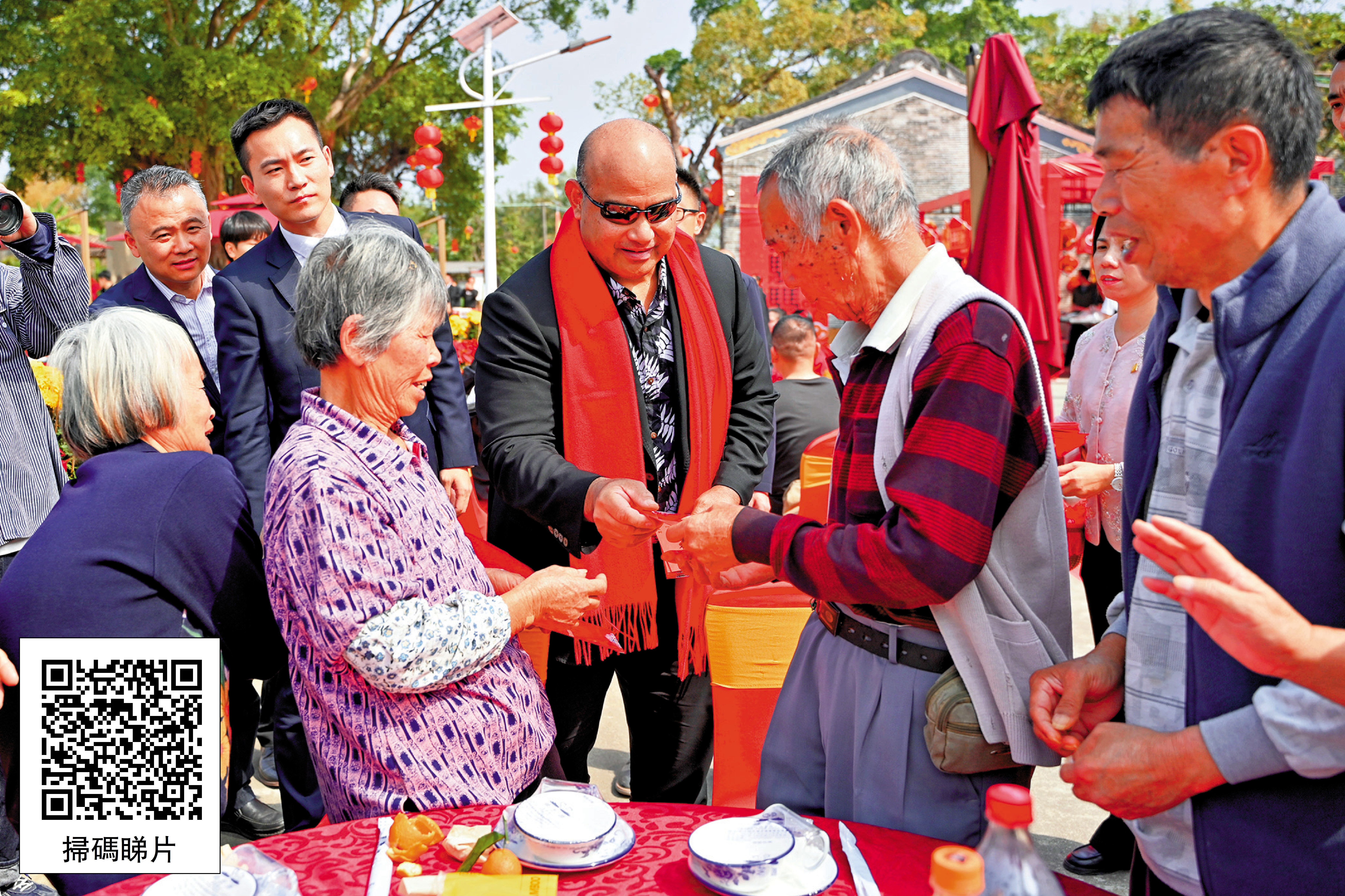 在村口的大榕樹下,當地書法家正在這裏揮毫創作。阿迪昂亦在鄉親的簇擁下,欣然提筆,熟練地寫下兩個大大的「福」字。他特意將兩個「福」字分贈江門市市長吳曉暉和村中高齡的譚婆婆,祈願她們「福運臨門,平安順遂」。