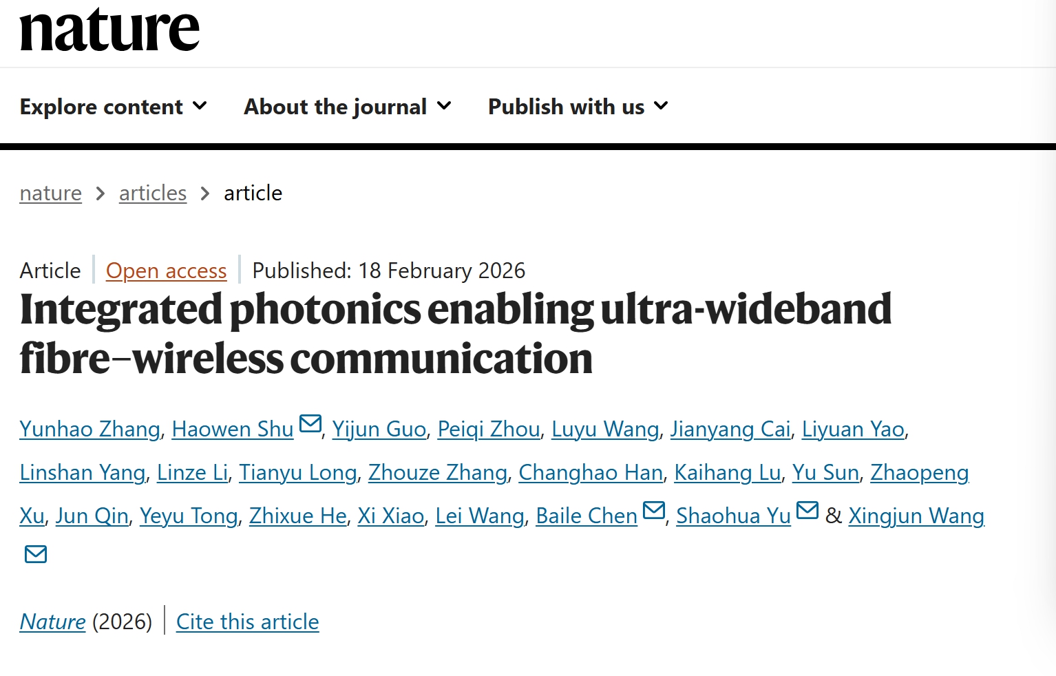 (大公文匯網 記者 江鑫嫻 北京報道)中國科學家在光通信和下一代無線通信(6G)領域突破三項世界紀錄,在全球範圍內率先實現了光纖和無線通信系統間的跨網絡無縫融合。2月18日,該研究成果以《集成光子學賦能超寬帶光纖-無線通信》為題,在線發表於國際頂尖學術期刊《自然》。論文通訊作者、北京大學電子學院副院長王興軍教授表示:「該成果就像是通信領域的『全能戰士』,除實現兼容且超大容量通信外,在能耗、成本、規模化等方面也有卓越的表現。未來可在6G基站、無綫數據中心等場景中廣泛應用。」