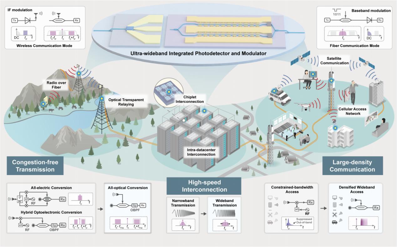 為此,由北京大學、鵬城實驗室、上海科技大學與國家信息光電子創新中心組成的聯合團隊基於多年研究首次提出了集成「光纖-無綫融合通信」概念,通過國產超寬帶光電融合集成芯片和AI賦能的先進均衡算法,在光纖通信、無線通信及其混合鏈路中進行創世界紀錄的數據傳輸速率實驗,最終實現了「一套系統、跨場景復用」的目標。這一里程碑式的突破有望重塑電信通訊系統架構,為未來全光互聯的願景奠定研究基礎,推動中國在該領域實現跨越式發展。