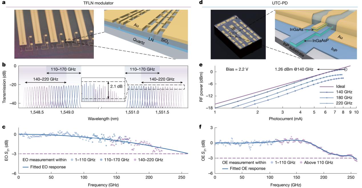 據悉,該成果成功突破三項世界紀錄,包括250 GHz以上超大帶寬的光電/電光轉換器件、薄膜鈮酸鋰調製器(TFLN MZM)和磷化銦探測器(InP UTC-PD)帶寬。