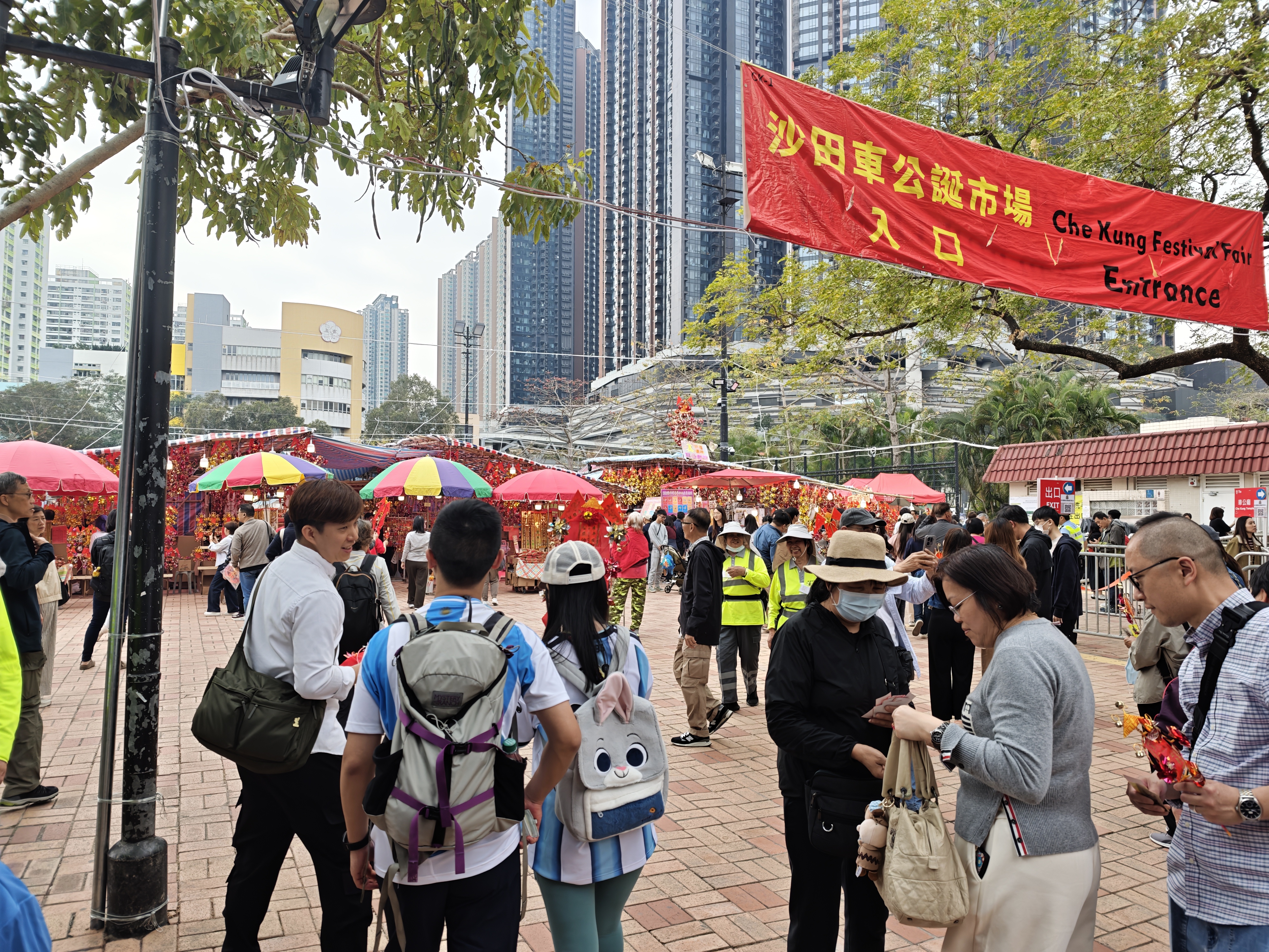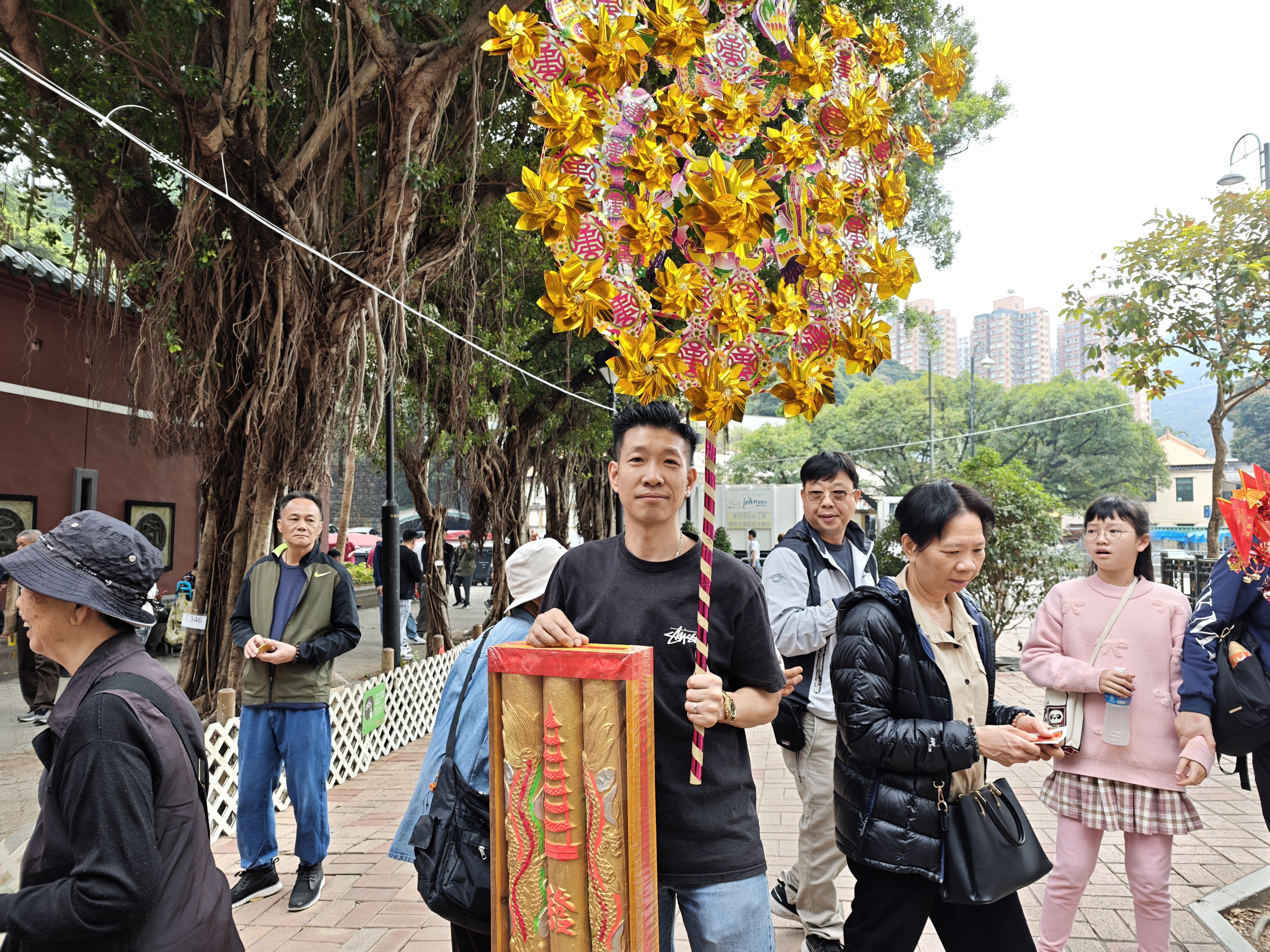 記者今早見到,車公廟外大排長龍,而廟內則人頭湧湧、氣氛熾熱,不少人都手持線香入廟參拜。市民蔡先生手捧近人高的風車和拳頭粗細的香燭,在人群中「脫穎而出」。他說,風車和香燭是其特地從車公誕市場以近2000元購入,祈願可以有一個「好好嘅運氣」。是次祈福,他說會「跟返傳統」,拜車公、攝太歲,希望香港新一年「經濟好、生意好」。