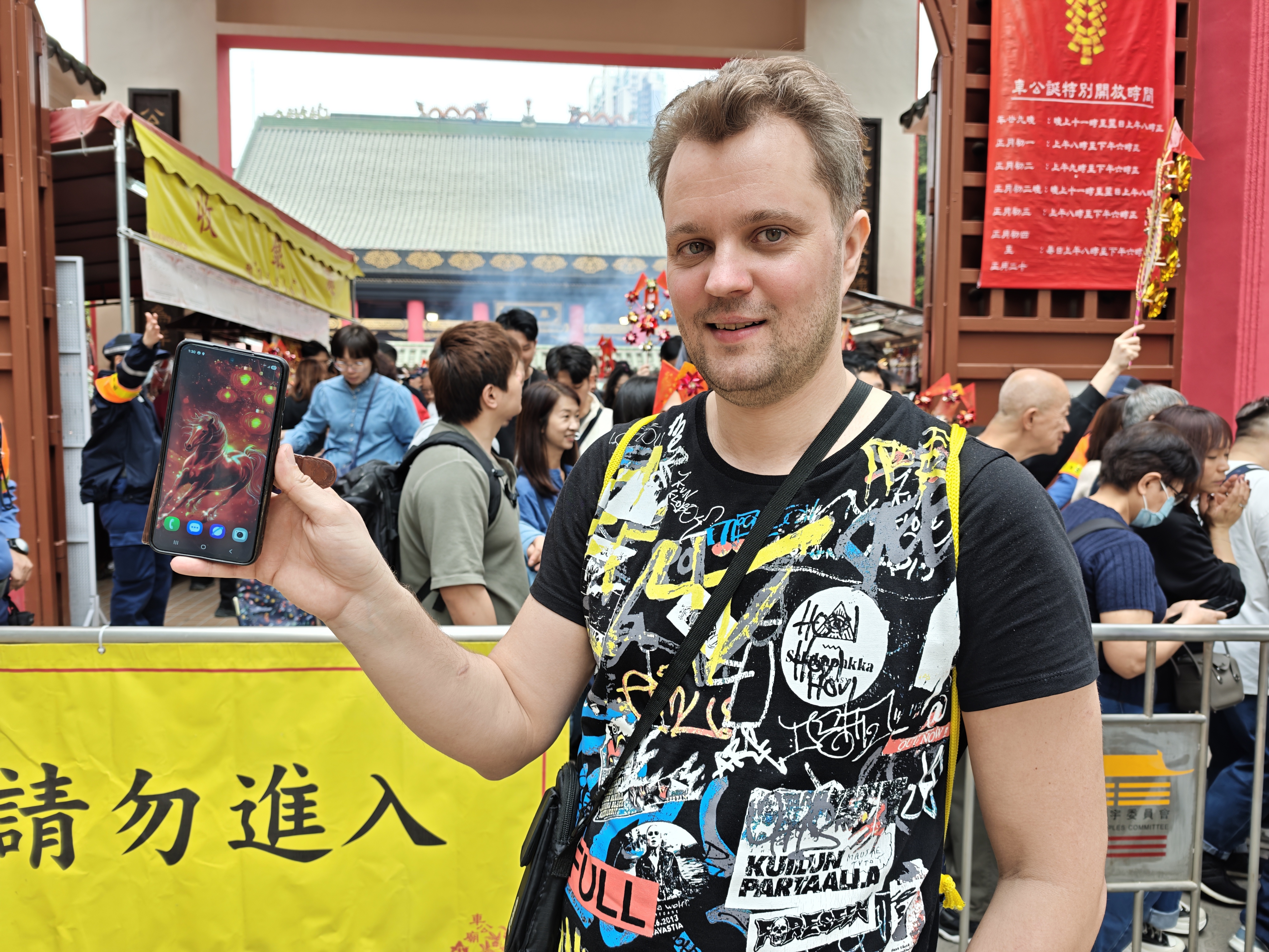 來自立陶宛的遊客Marius從人山人海的車公廟出來後精疲力盡。昨晚剛剛到港的他專為慶祝春節而來,今日計劃拜訪香港各處寺廟,早前已拜訪黃大仙祠,接下來還打算去萬佛寺朝拜。談及是次車公廟經歷,他被廟內人流深深震撼,感慨「太瘋狂了」,「這麼多人就在這一天排隊,只為來寺廟」;可惜他對習俗並不熟悉,因此並未體驗祈福等活動。他說,希望寺內提供更多相關信息,幫助國際旅客了解香港文化。