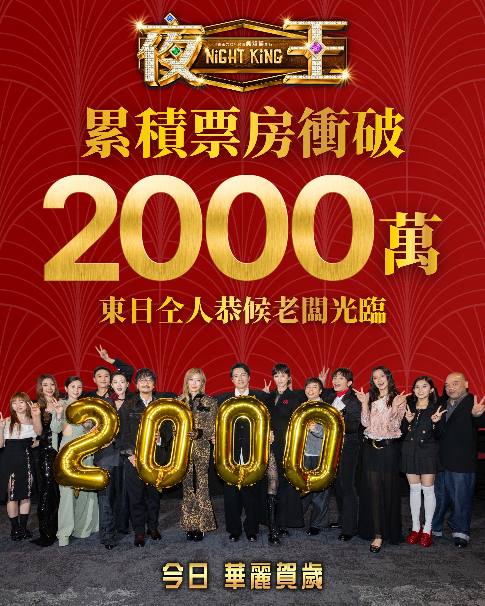 (大公文匯全媒體 特約記者 陳惠芳)黃子華、鄭秀文領銜主演的賀歲電影《夜王》累積票房持續飆升,初一單日收逾千萬票房,於今日(19日)年初三早上正式突破2000萬大關。《夜王》官方社交平台發文向觀眾致謝,笑言「赤口東日仝人都好好口」,並感激各位「老闆」的支持。