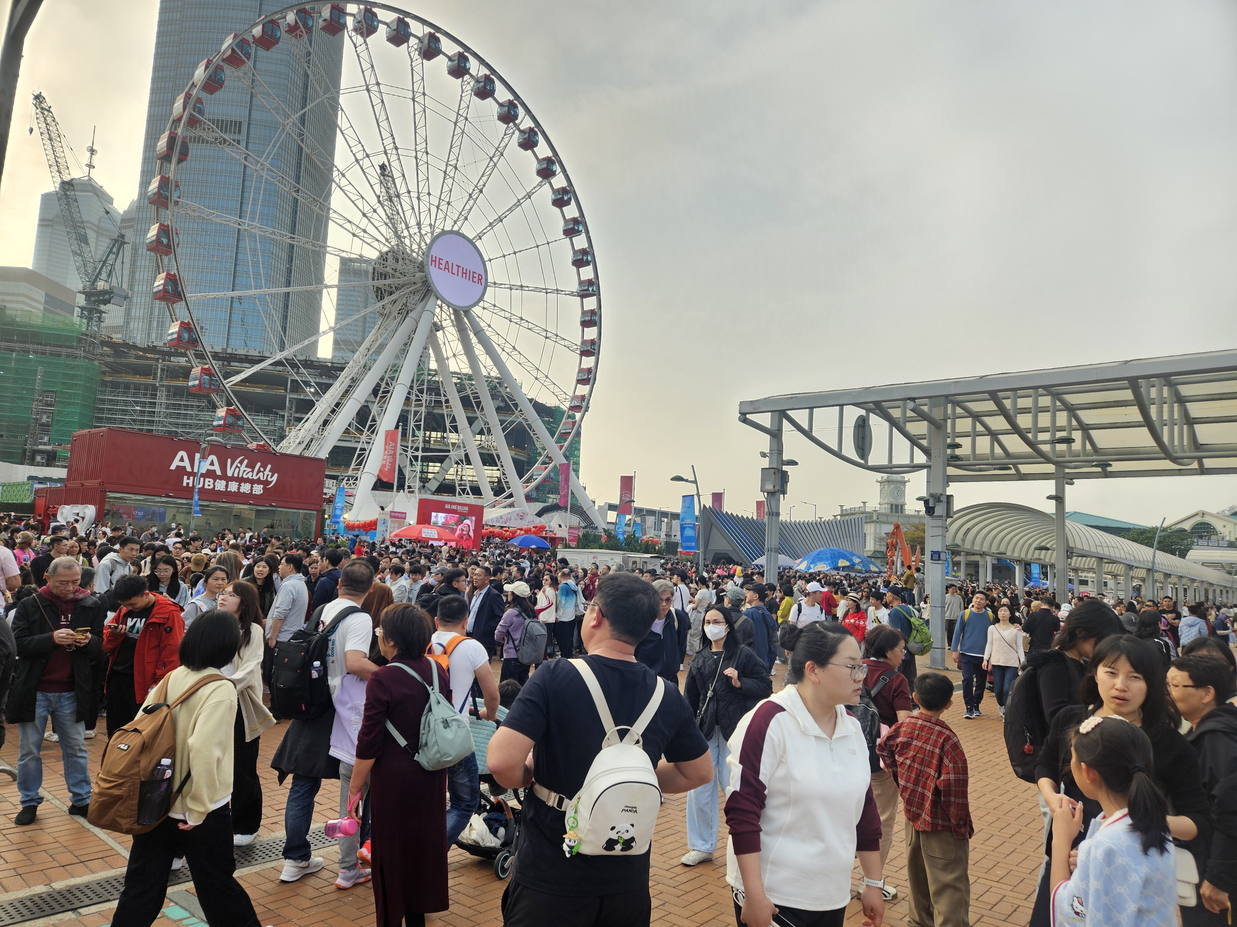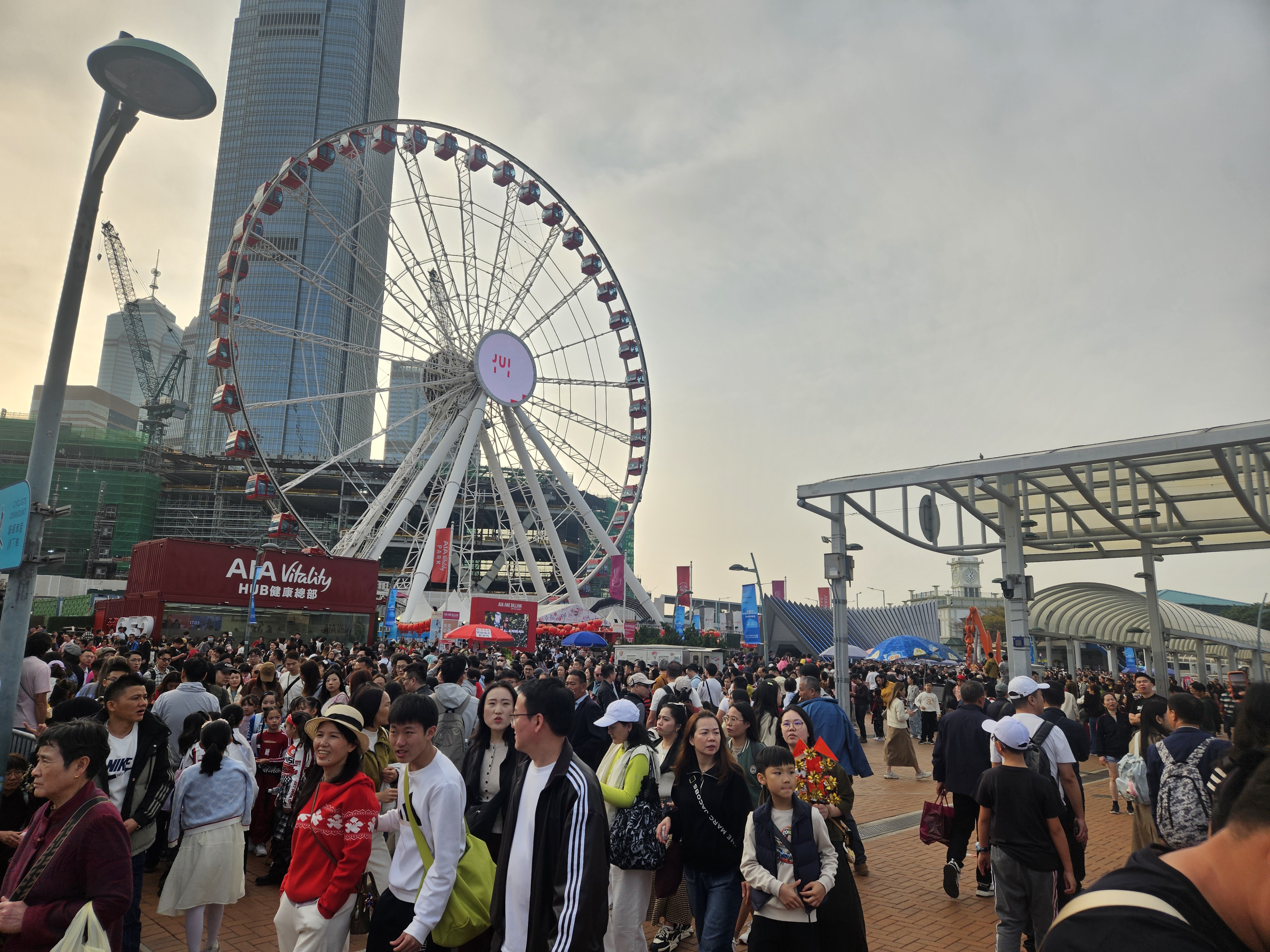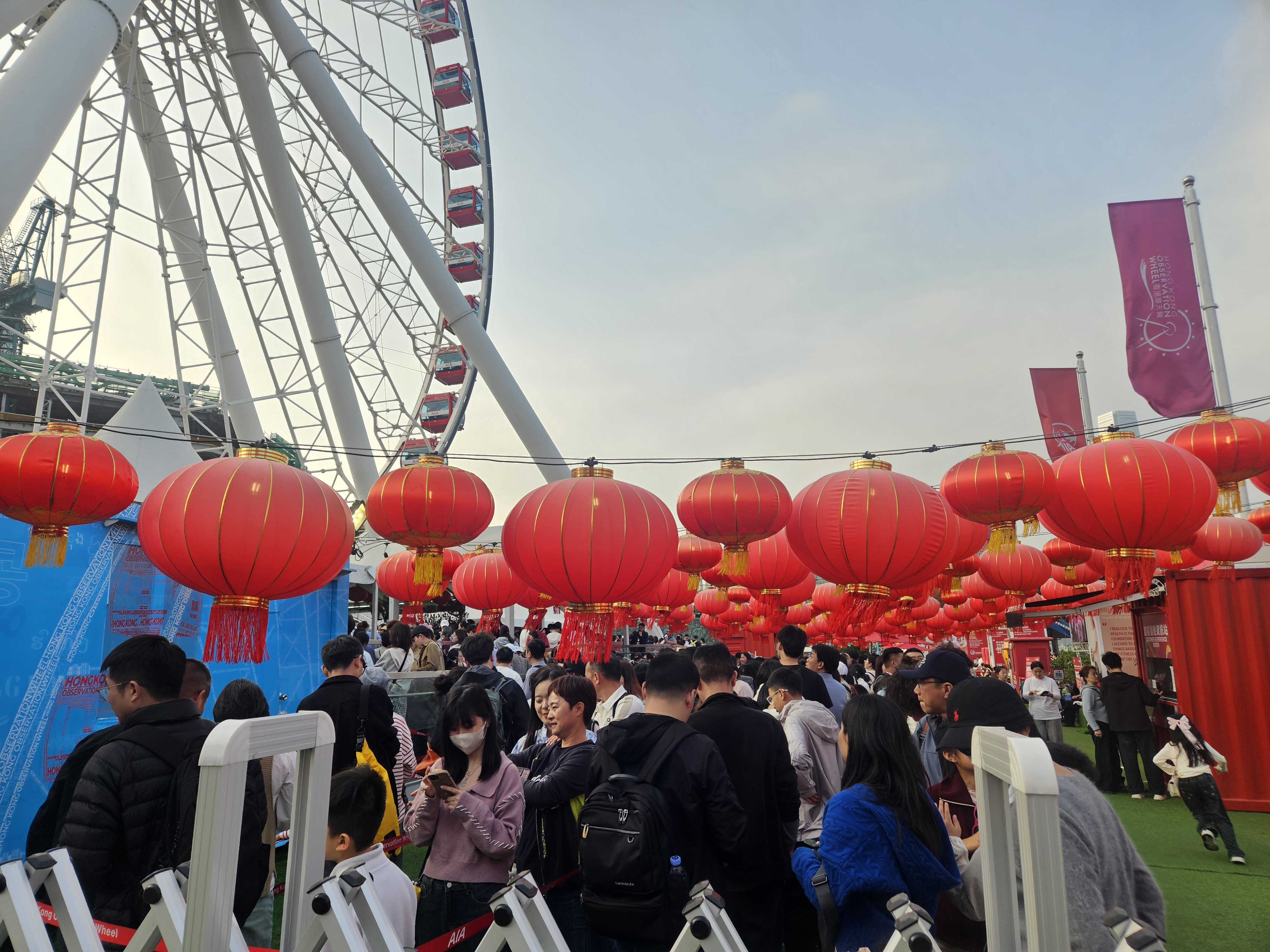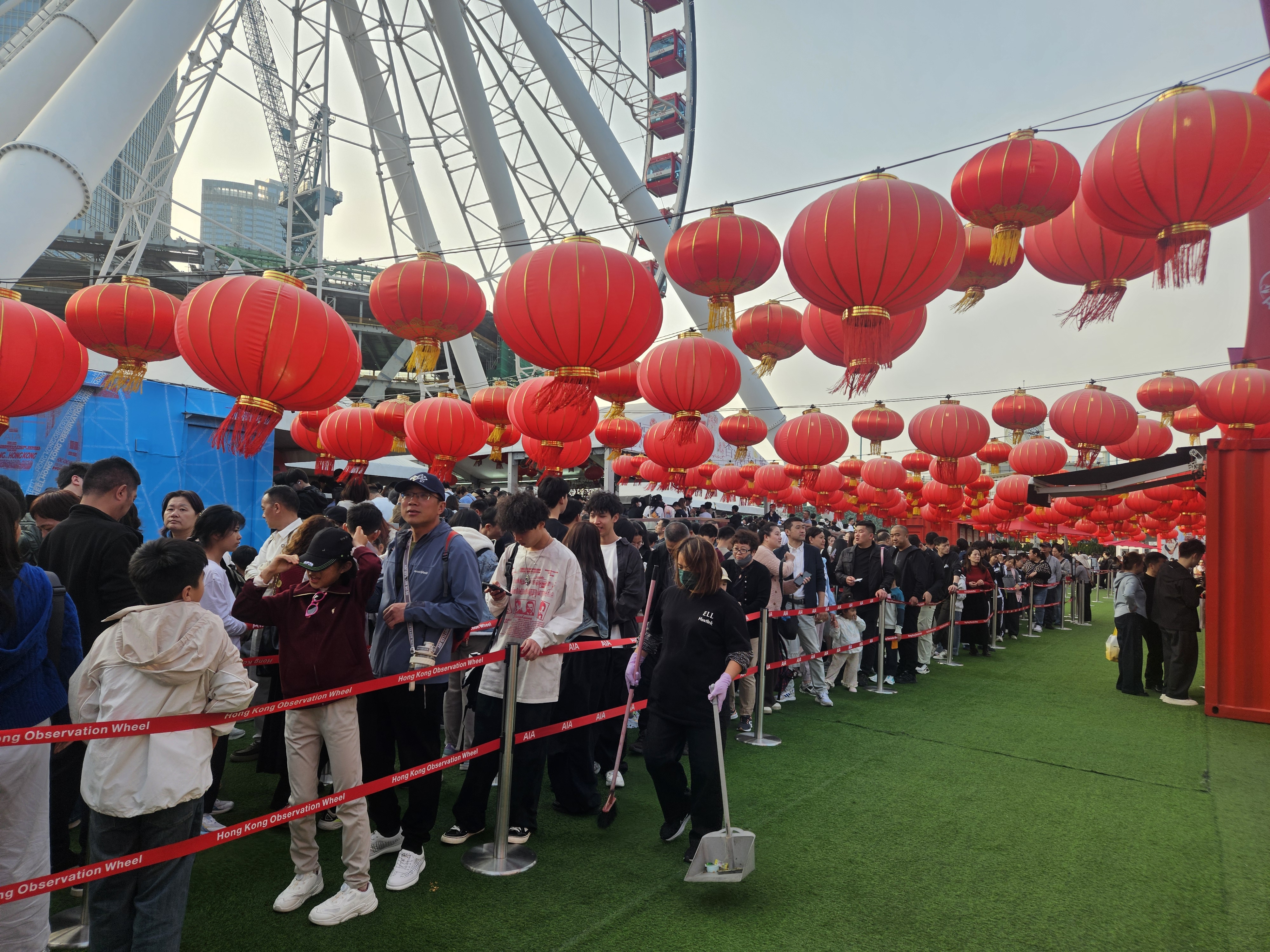 大公文匯全媒體報道,今日(19日)是大年初三,許多市民紛紛外出歡度新年。下午4時許,記者在中環摩天輪看到,現場排起長龍,輪候隊伍長得望不到盡頭。
