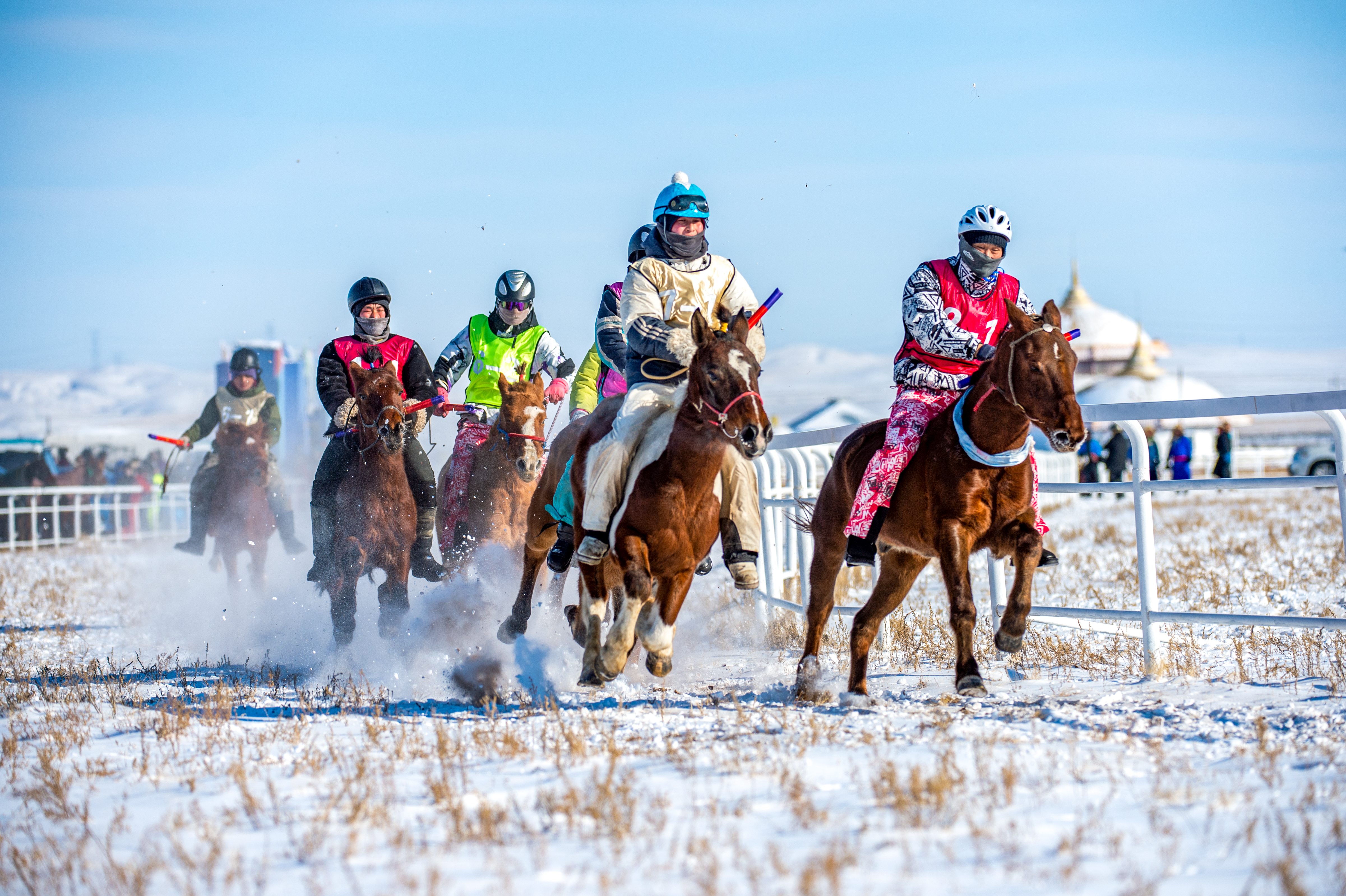 賽馬是那達慕大會「男兒三技」之一,不分老幼、不限性別,騎手身着綵衣、不備馬鞍,策馬疾馳,頭馬會獲重獎,末馬則被澆酸奶善意調侃,既展現騎術精湛,也傳遞着奮進向上的力量。此外,馬奶酒祭祀、婚禮中以馬為聘禮、喪葬中憑馬擇葬等習俗,處處彰顯着蒙古族對馬的尊崇。