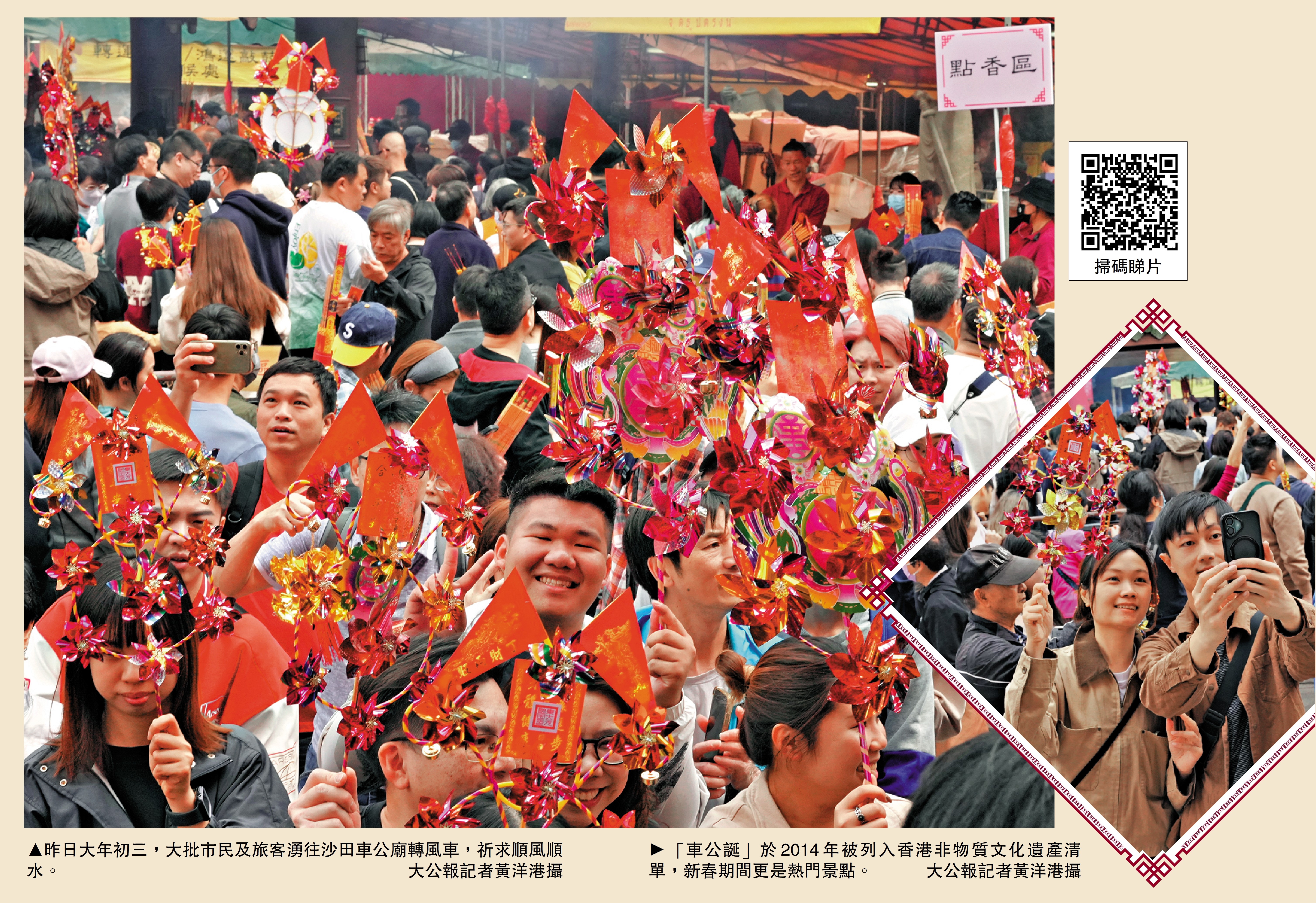 大年初三俗稱「赤口」,傳統上認為不宜拜年,以免有口舌之爭,不少市民會前往沙田車公廟求籤轉風車祈福。大公報記者昨日上午11時抵達車公廟,周邊已被祈福人潮覆蓋,人龍綿延數百米,有輪候市民說,排隊入廟耗約半小時。