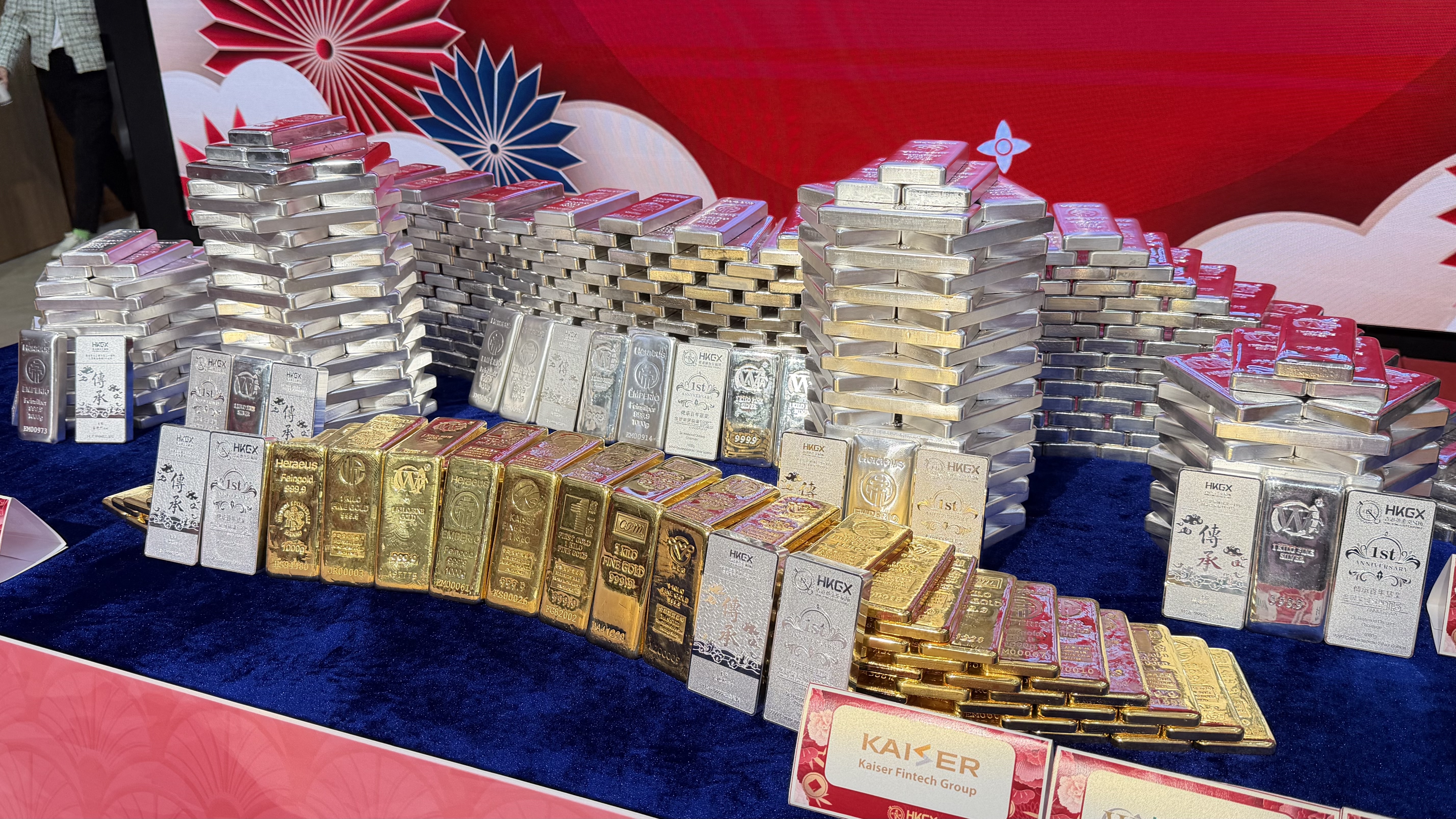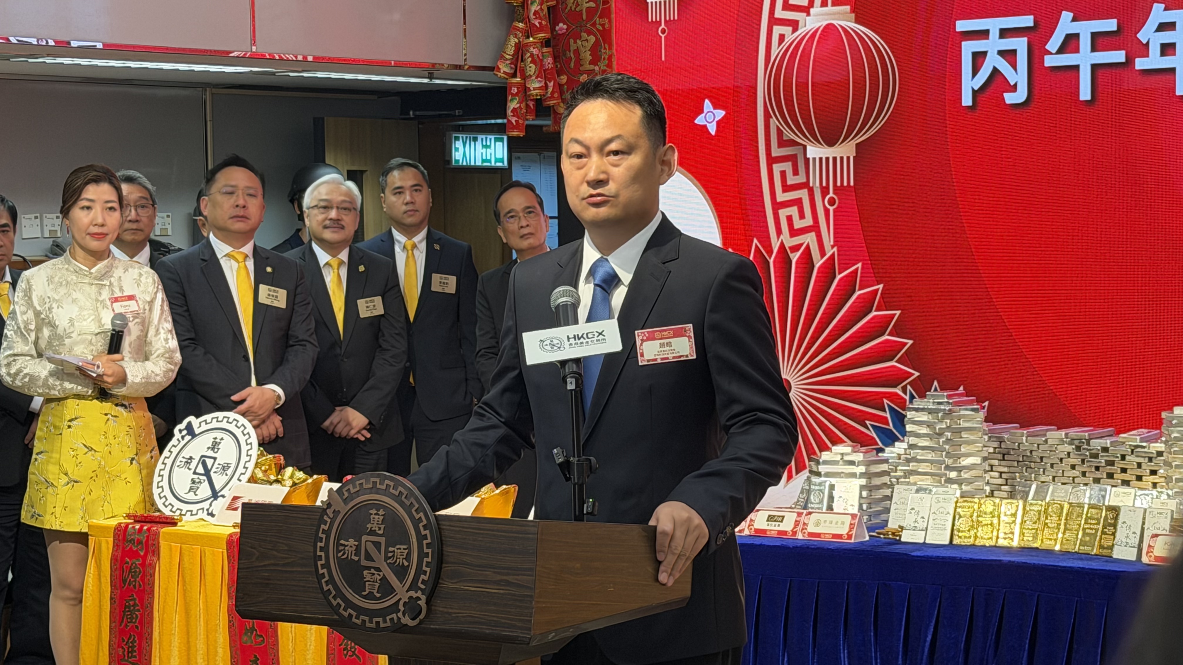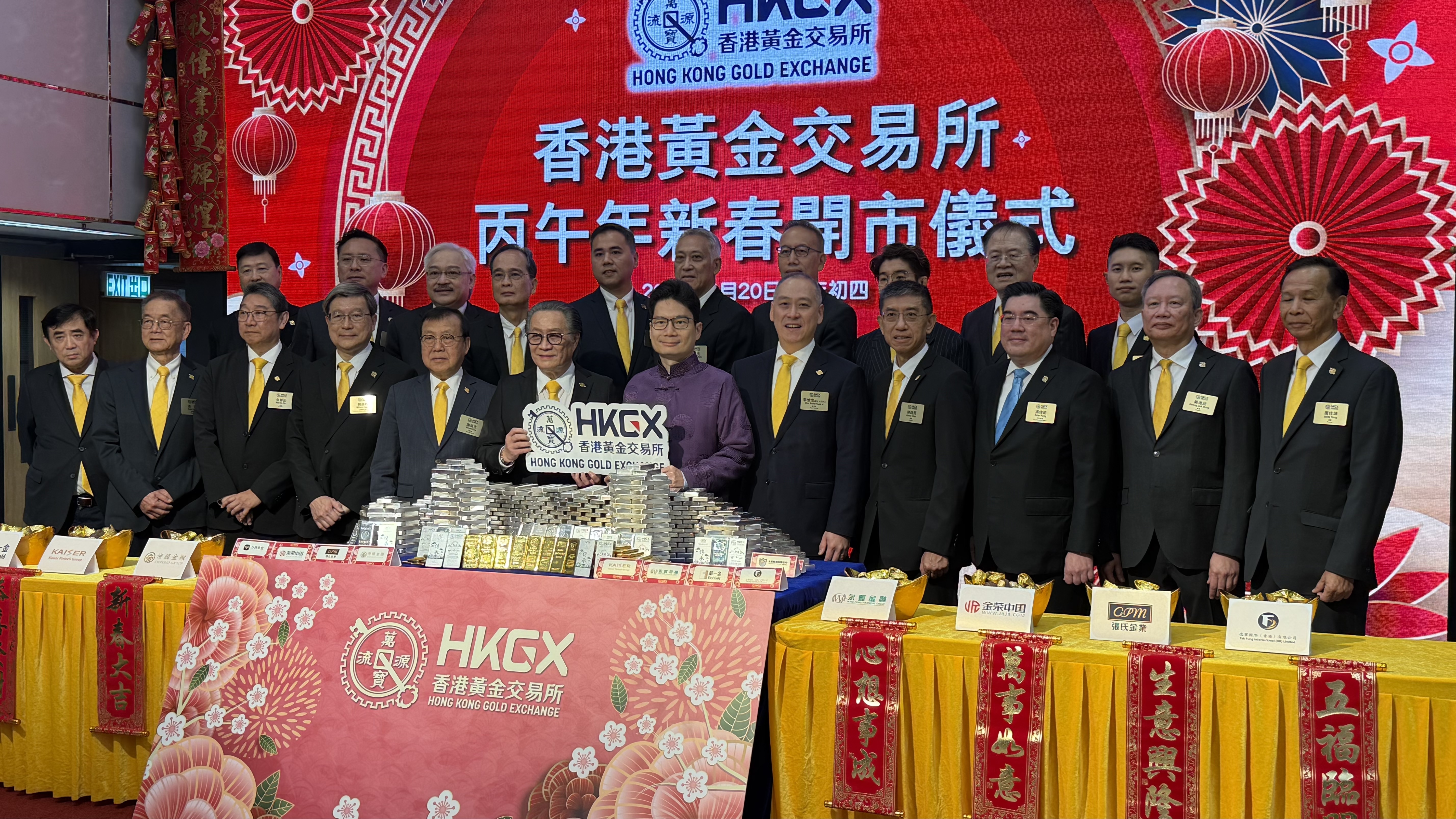 (大公文匯全媒體記者 劉妍伶)今日是大年初四(20日),香港黃金交易所舉行丙午年新春開市儀式。財經事務及庫務局副局長陳浩濂擔任主禮嘉賓,港金所主席張德熙,副主席、立法會金融服務界議員李惟宏及副主席謝滿全,以及董事陳銘潤等港金所高層出席。現場展示約800條黃金及白銀,重量近1噸,總值約兩億港元。