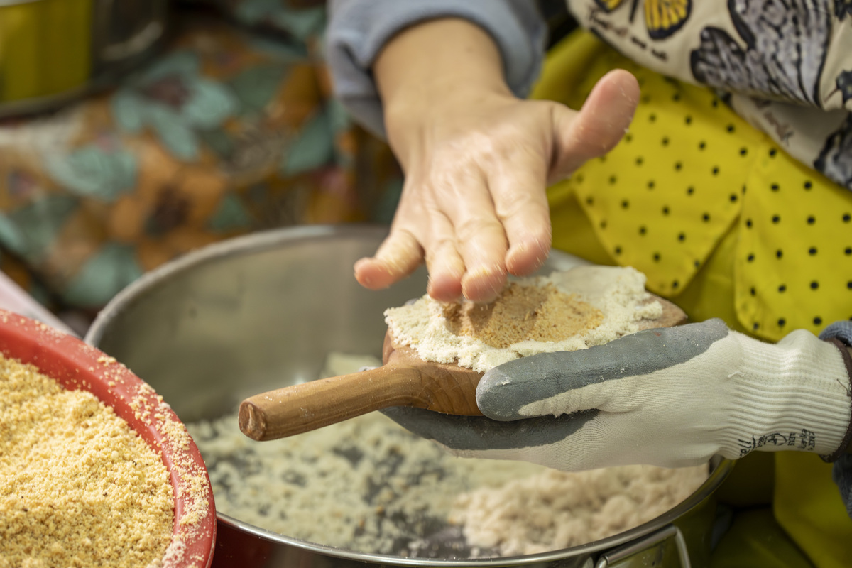 首先要把粘米炒至金黃香脆,然後放涼磨粉,加入用片糖煮成的黃糖水,搓揉成粉團。廖超華解釋,這些用作餅底的粉團也有標準,要做到一握成團,一推就散。