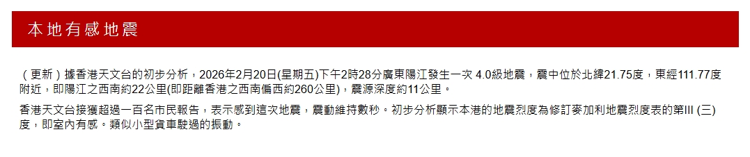 大公文匯全媒體報道,據香港天文台的初步分析,今日(20日)下午2時28分,廣東陽江地區發生了一次強度為4.0級的地震。震央位於北緯21.75度,東經111.77度,大約在陽江西南方22公里處,距離香港西南偏西約260公里,震源深度約為11公里。