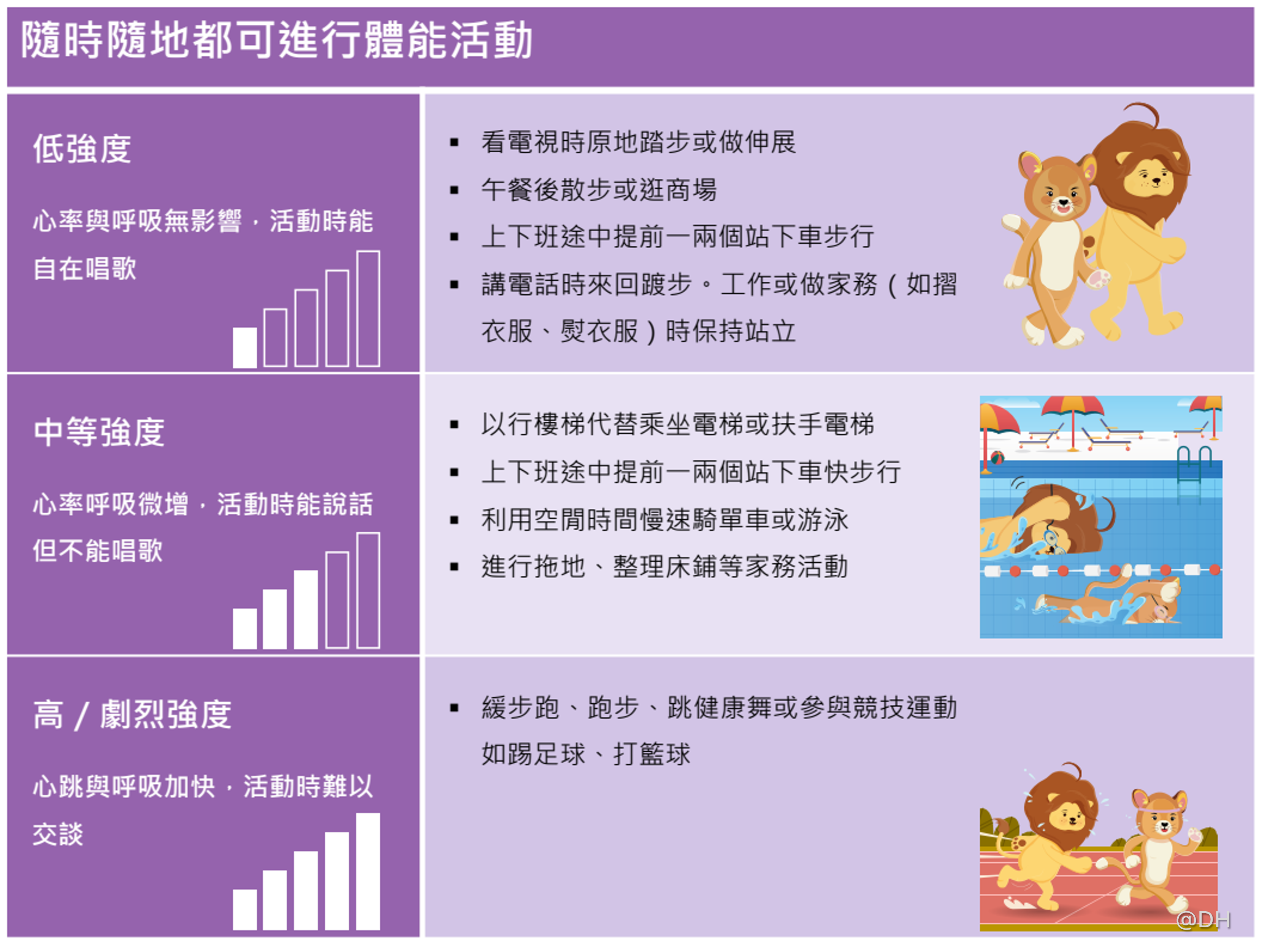 研究顯示,定期進行體能活動有助防控非傳染病,例如三高(高血壓、高血糖和高血脂)、心臟病、中風及大腸癌和乳癌等常見癌症,還有利於控制體重、增強免疫力和改善心理健康。在安全情況下進行任何形式的體能活動,都有益身心。其中,中等至劇烈強度的運動對提升心肺功能尤其有效。最新研究亦指出,每日僅5分鐘的中等強度運動,也可降低死亡風險。因此,勿以善小而不為。別再等,今天開始運動,把體能活動融入生活中。