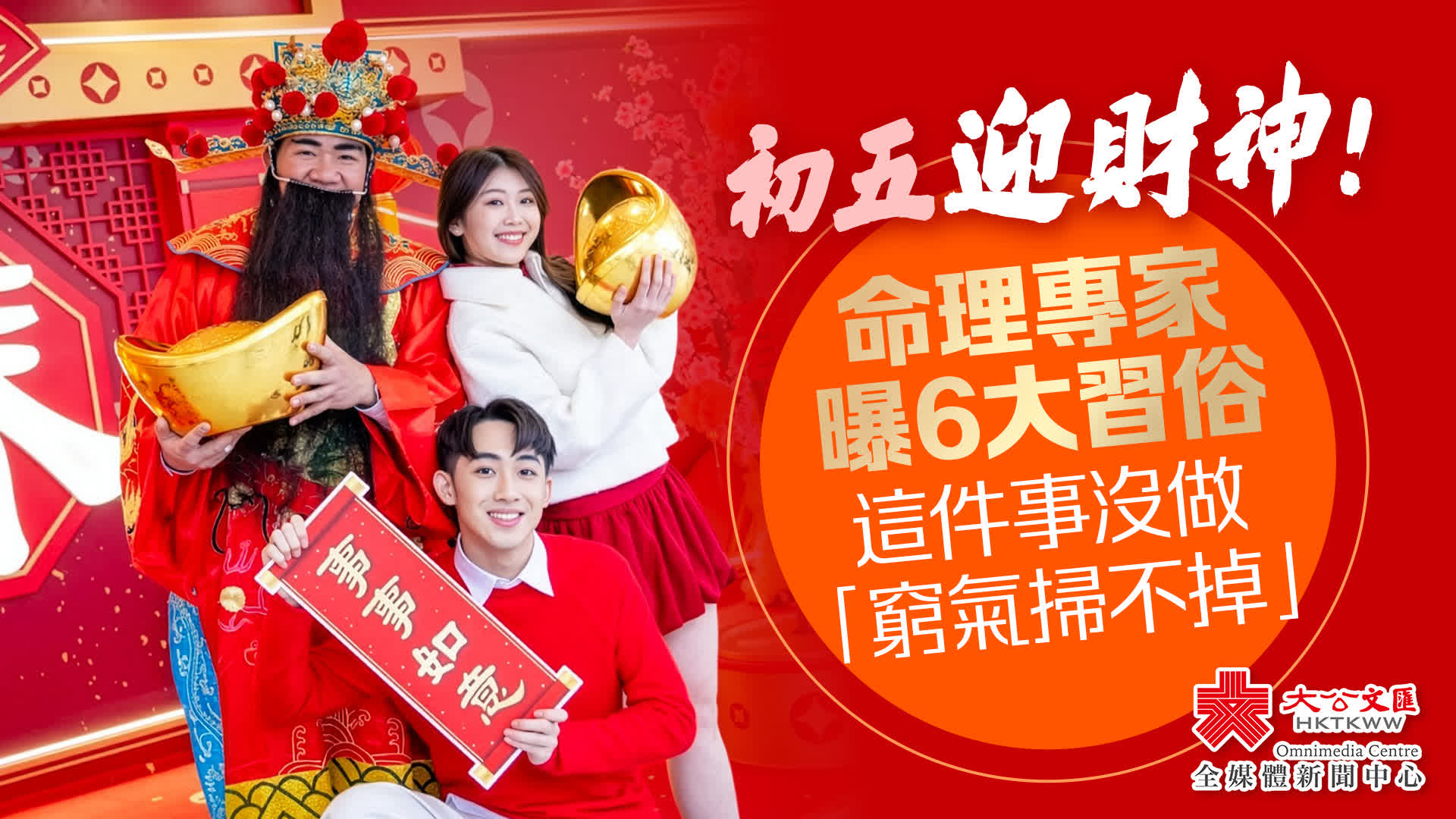 大公文匯全媒體報道,今日(大年初五,21日)因適逢財神生日,因此有「迎財神」習俗。不過,台灣命理專家「清水孟國際塔羅小孟老師」也透露,這天因初一至初五禁忌完全解除,故又被稱為「破五日」,雖然當天沒有什麼重大禁忌,但也要遵守6習俗,才能真正達成「迎富送窮」!
