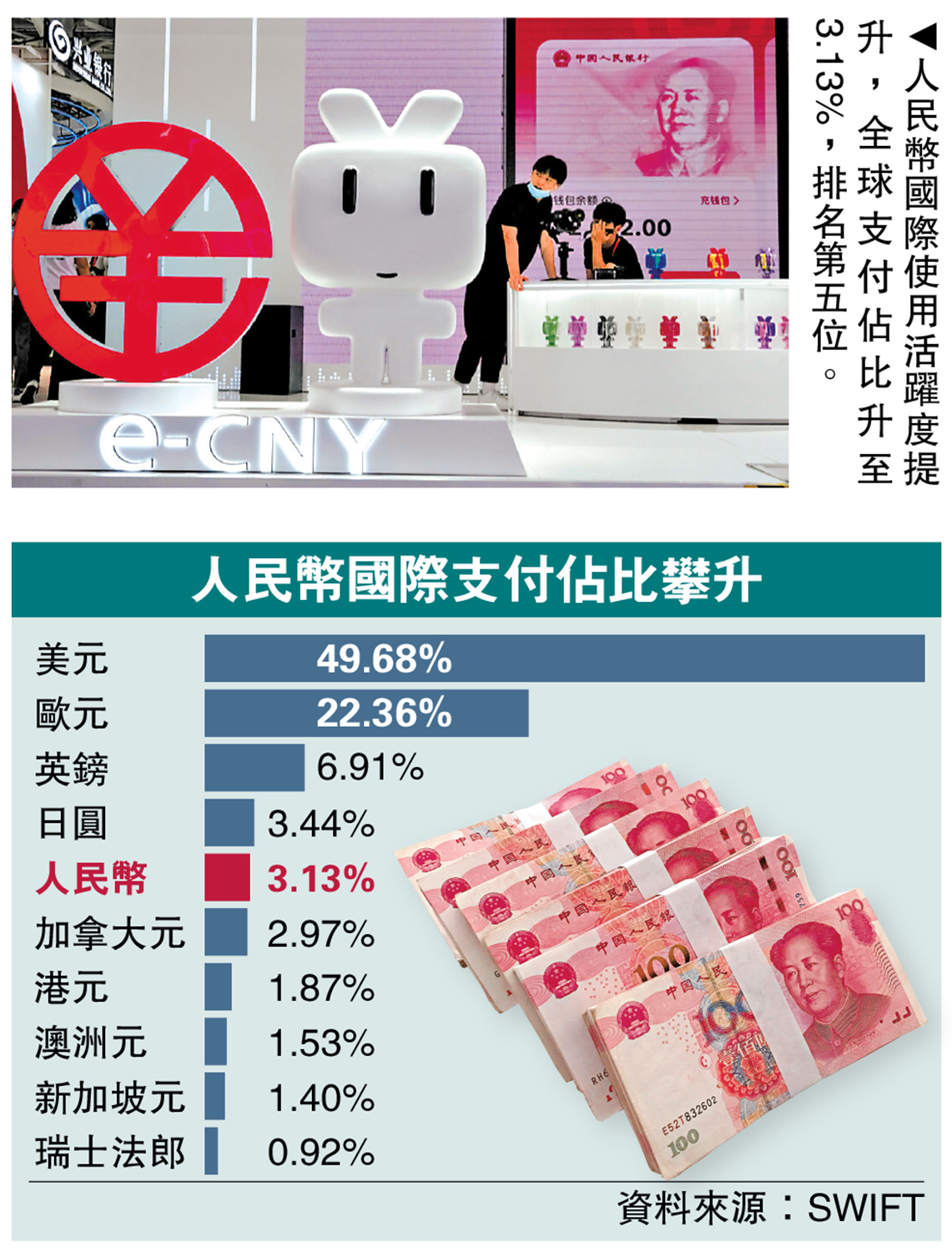 人民幣支付金額總體方面,與去年12月相比,今年1月增加了11.44%;同期所有貨幣支付金額總體減少2.68%,反映人民幣國際使用活躍度有所提升。
