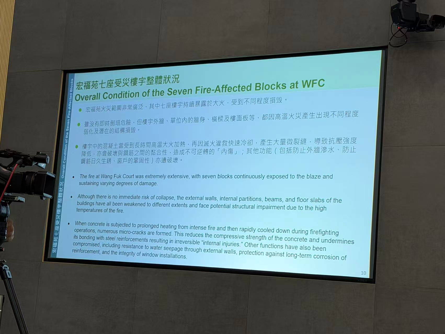 何永賢表示,宏福苑7座樓中,有些受災情況嚴重,包括石屎牆剝落、僅剩鋼筋,有些樑柱彎曲變形。檢測樣本中發現,7座樓宇均受過高溫火災,救火時經過灑水冷卻,熱脹冷縮令石屎結構出現裂痕,影響所有7座樓宇日後的維修保養及結構安全,加上災後加裝支撐結構,令樓宇不適宜居住,涉違《建築物條例》等相關法例。