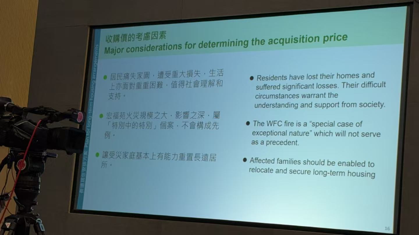 黃偉綸指出,由於目前沒有任何有效的市場機制可以幫助受災的住戶,政府因此提出用現金或者「以樓換樓」的方式收購宏福苑這7座所有單位的業權,這個方案可以最快且最靈活地解決受災業主住戶的長期居住需求,而政府成為單位的業權人之後,將承擔並處理各種法律和保險事宜方面的風險。