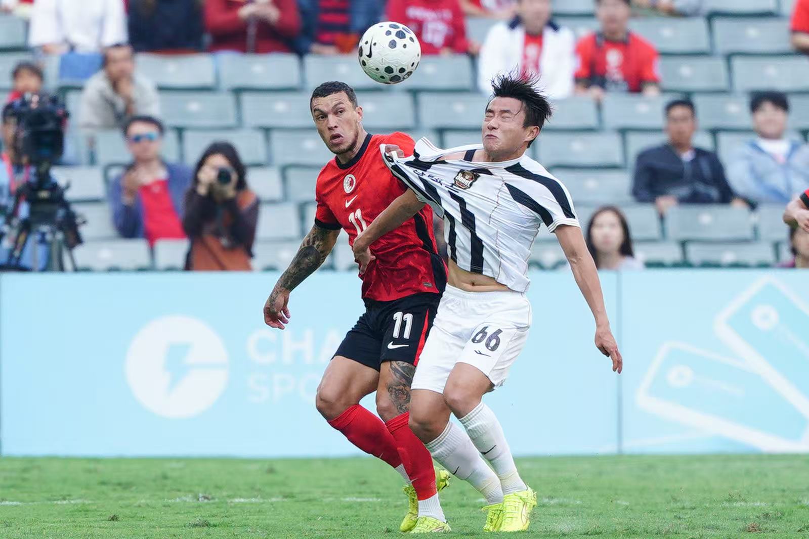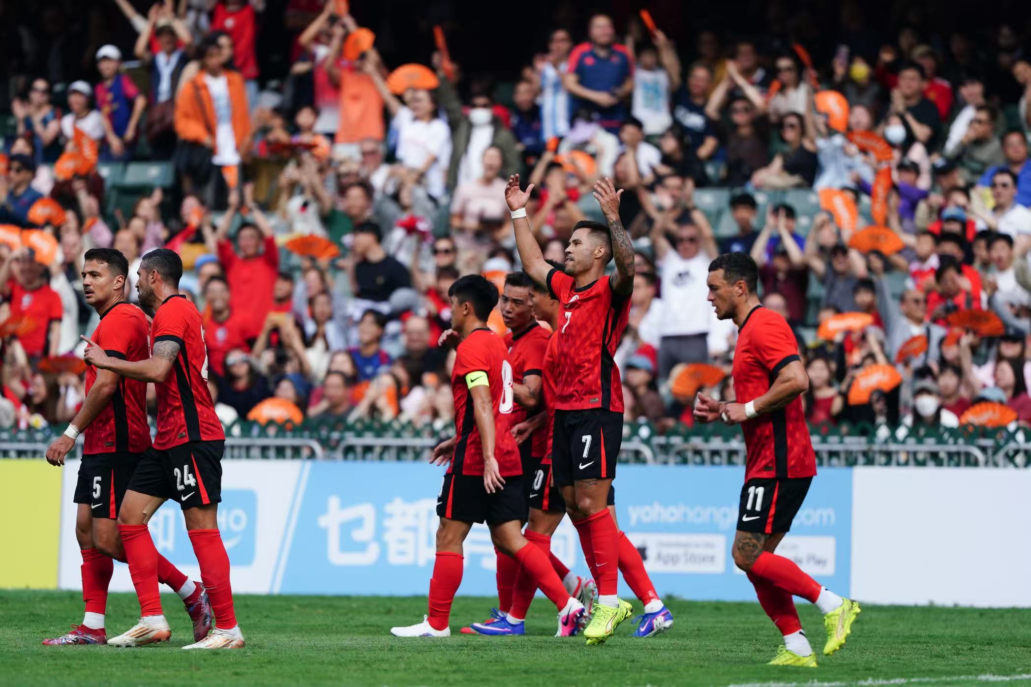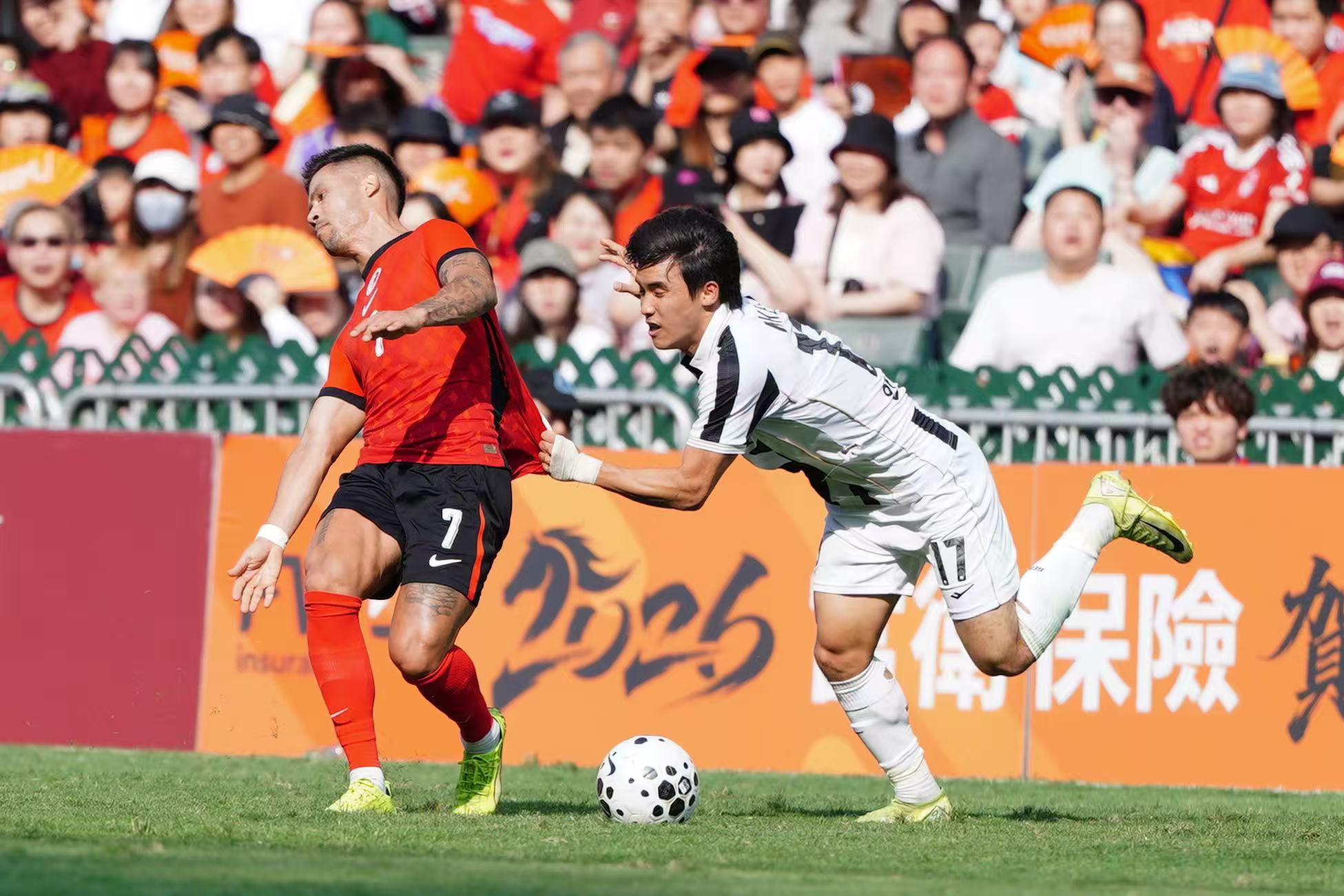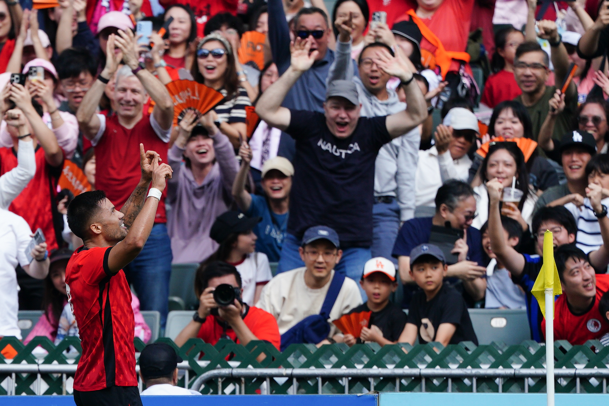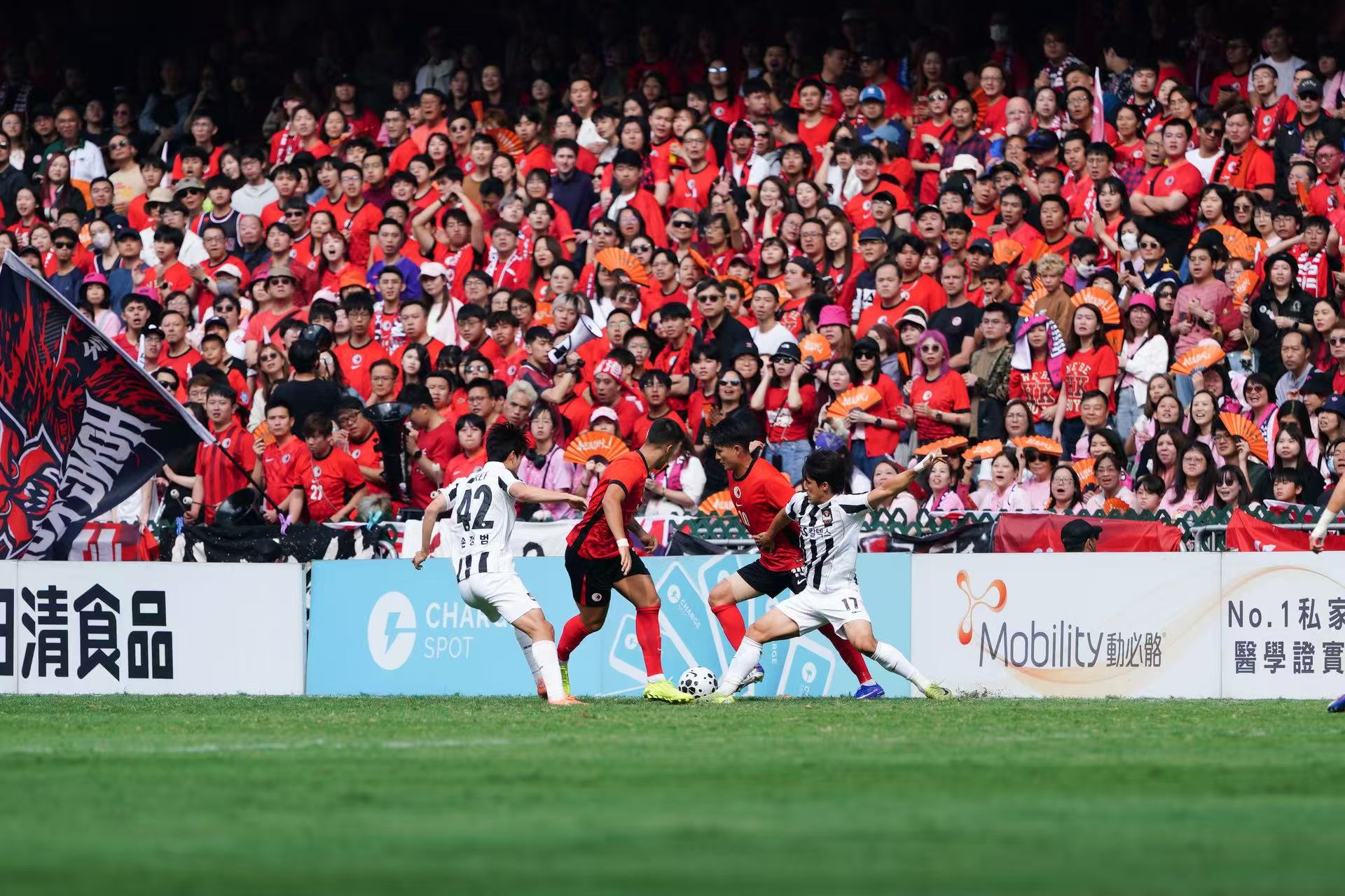 比賽於下午3時正式開始,不少身穿紅衣的球迷已提前到場,在看台擊鼓揮旗,為心儀球隊加油打氣。當中,既有本地市民全家齊來賀年,亦有海內外遊客入場感受新年球賽的獨特氛圍。除了激烈賽事,其間還有舞獅及韓國拉拉隊的精彩表演。