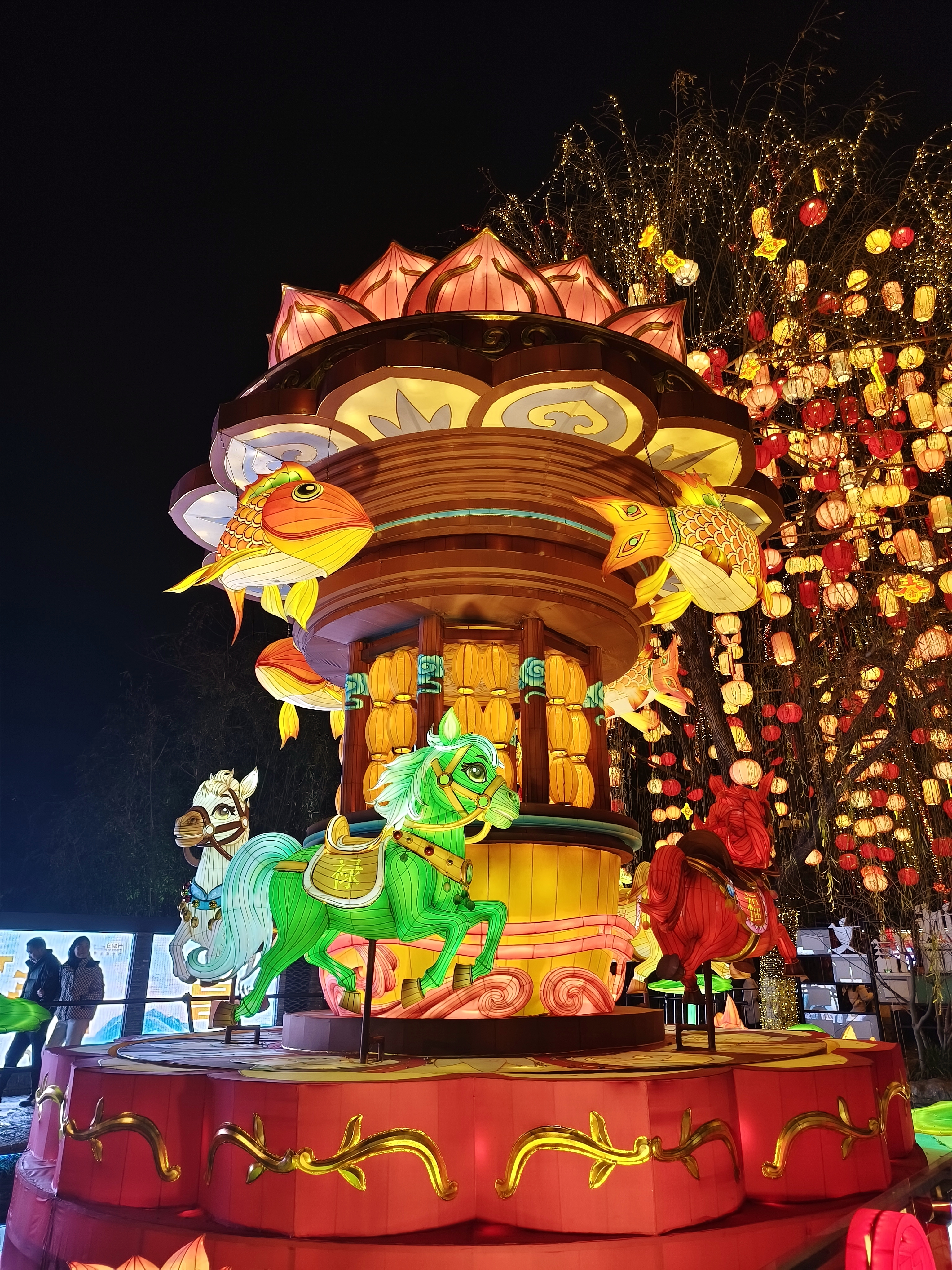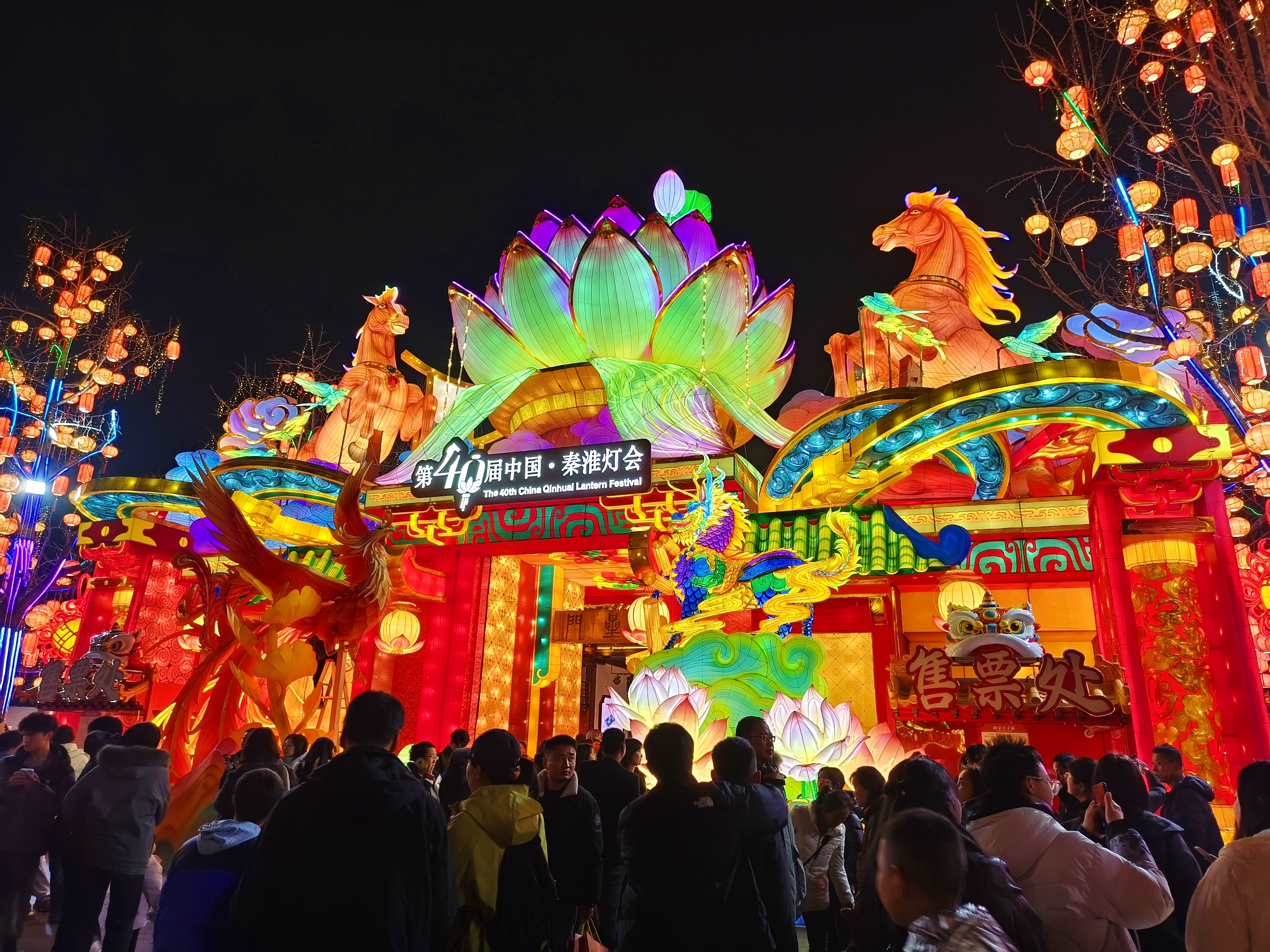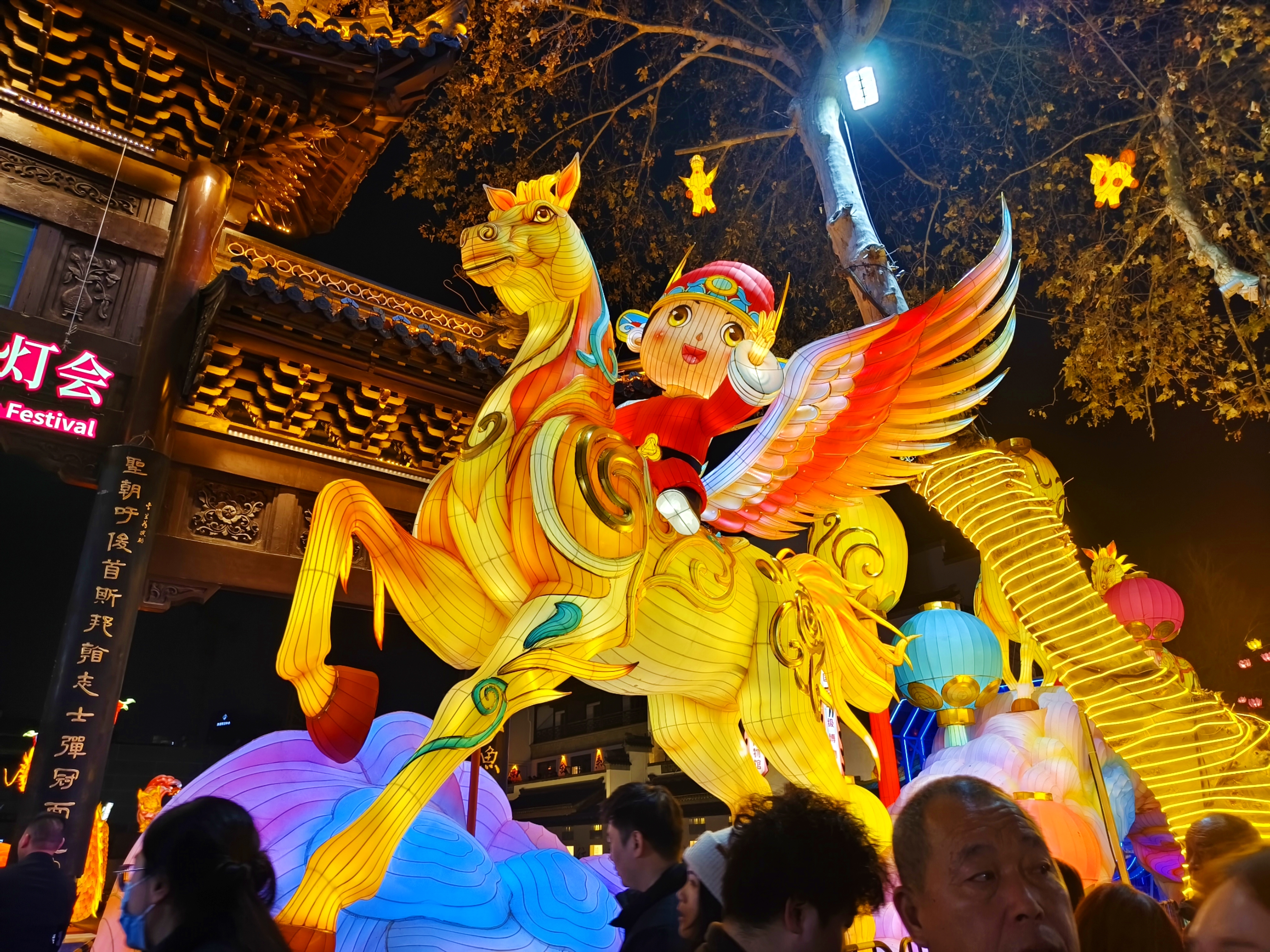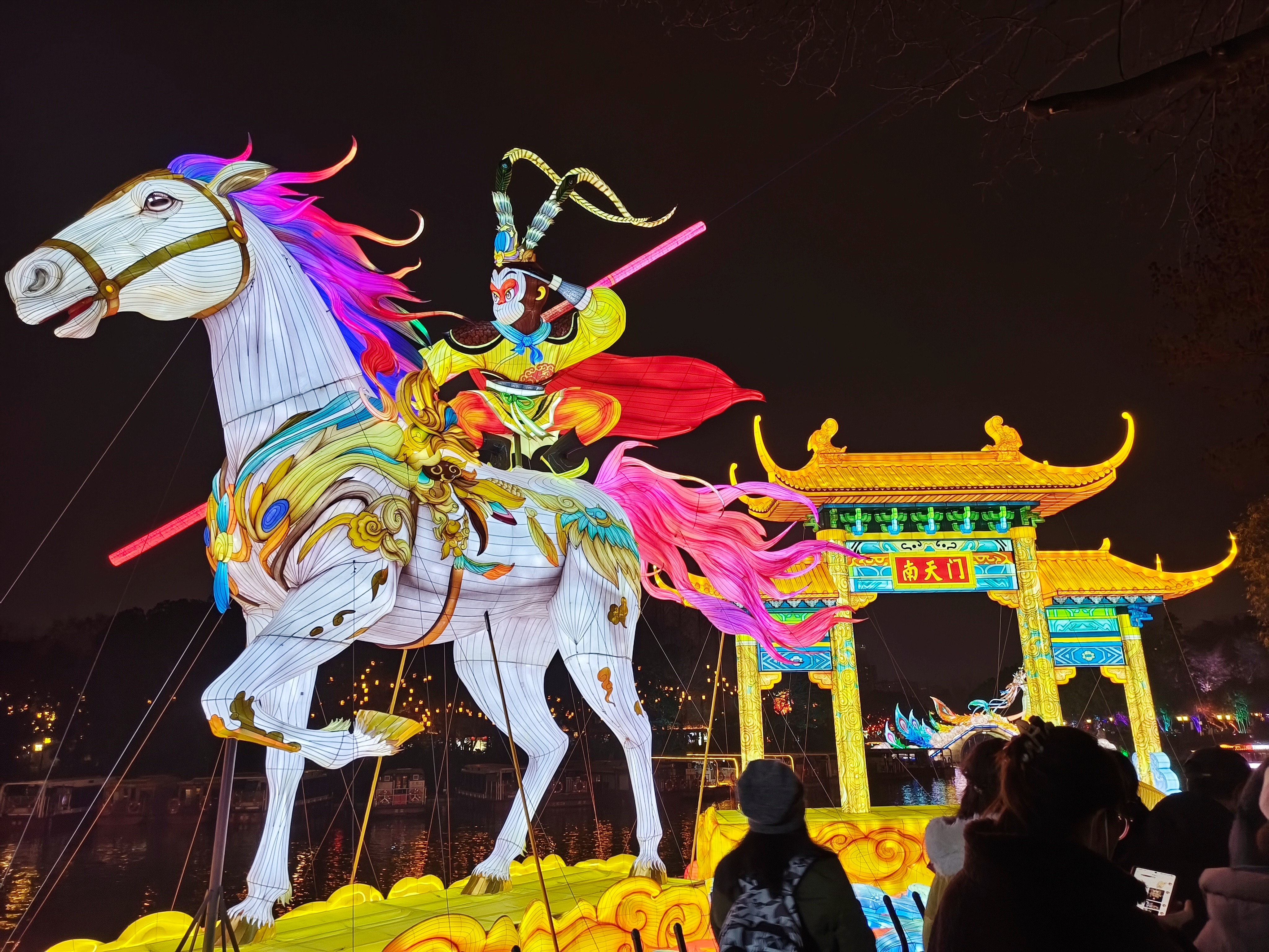 此外,中華門城牆上的Q版「聚寶小藍馬」憨態可掬,不僅延續了中華門「聚寶門」的財富傳說,還蘊含着「馬上有錢」的美好寓意;中國科舉博物館展區的「金榜題名」「龍馬精神」系列燈組,則寄託着對莘莘學子「馬上高中」的祝福;夫子廟大成殿展區以《山海經》中的神獸為靈感,設計了「鹿蜀鳴瑞」「乘黃騰瑞」等奇幻燈組,帶領遊客穿越神話世界、邂逅奇珍異獸。這些無處不在的馬年元素花燈,受到了市民遊客特別是年輕人的熱情追捧。