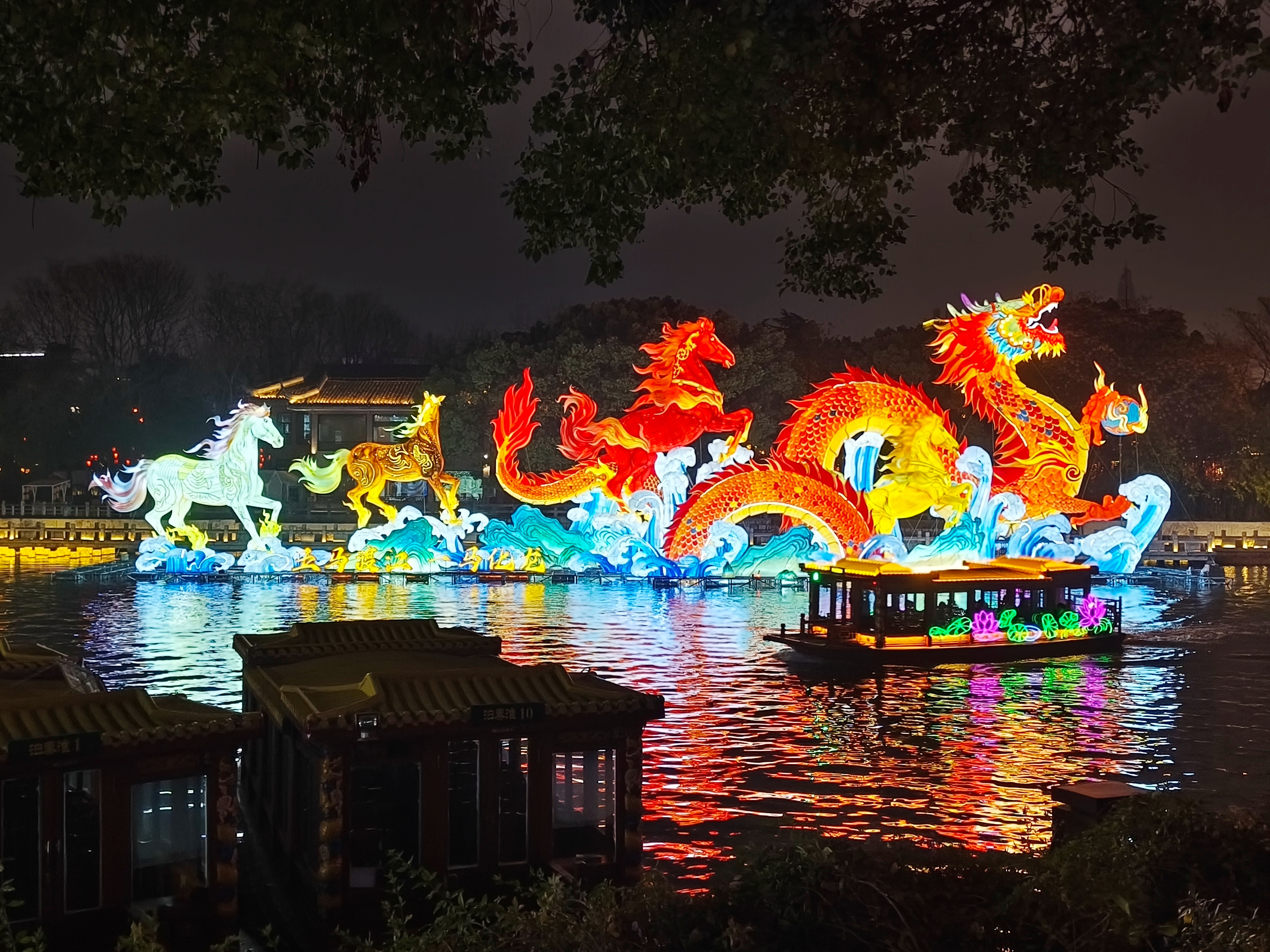 南京秦淮燈彩文化發展有限公司總經理惠南洋說,本屆燈會注重燈彩主題與傳統年俗、生肖文化的融合,特別創作「五馬渡江·一馬化龍」大型故事燈組。該燈組取材於歷史典故,運用聲光電技術生動再現神駿渡江、化龍騰飛的壯闊場景。巨龍昂首吐納雲氣,龍珠閃轉生光,既寓意華夏文明源遠流長,也寄託着吉祥祝福與城市奮進的時代精神。