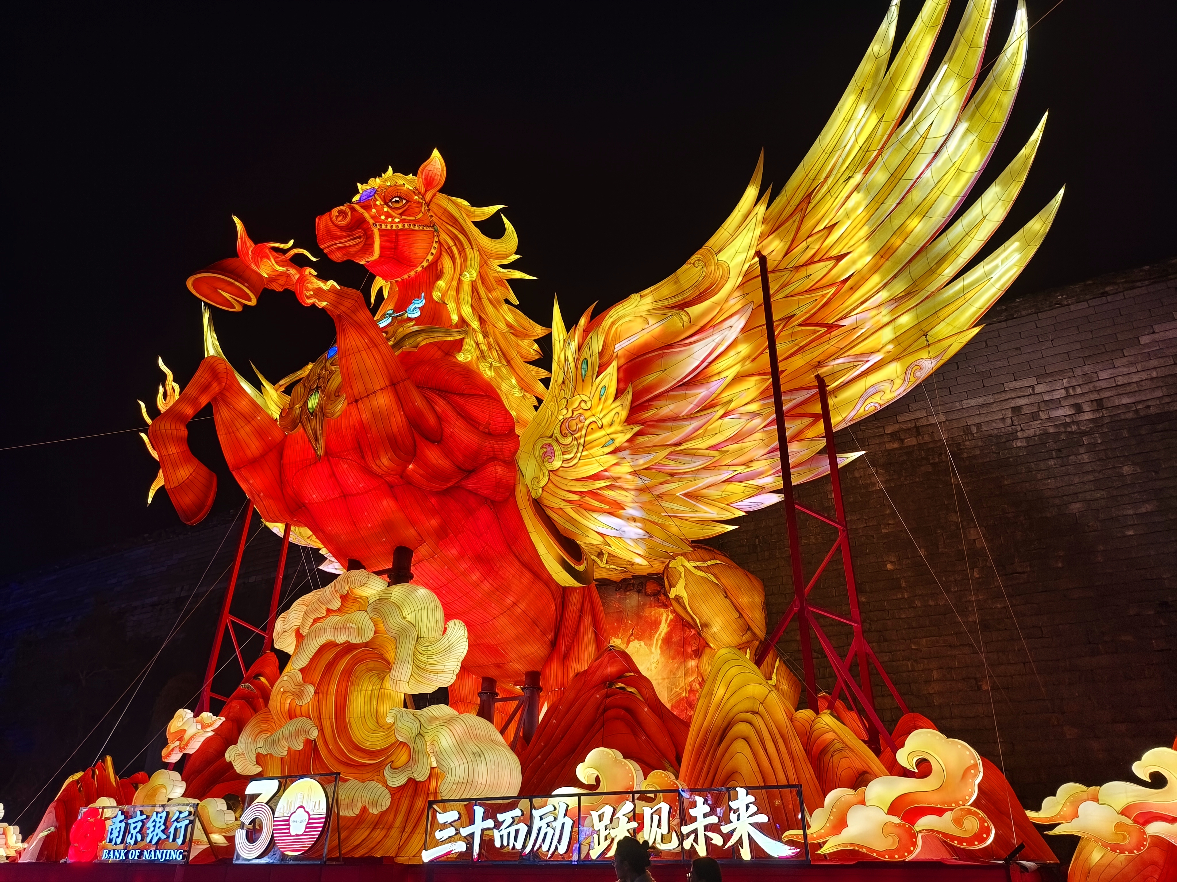 今年適逢秦淮燈會恢復舉辦40周年,本屆燈會共設有8個展區、約390組燈彩,布展規模與燈組數量均創下歷史新高。其中,門東展區圍繞生肖主題,打造了30餘處造型各異的「馬」燈和氛圍燈。例如,緊鄰明城牆的「赤焰神駿耀金陵」主生肖燈高15米,寬28米,這是門東自亮燈以來的最大生肖燈。這匹「飛馬」創新採用「五維」觀賞設計,涵蓋俯視、東西側視、正面、仰視五個角度,確保在任何位置都能獲得最佳觀感,吸引大量市民和遊客前去「打卡」。