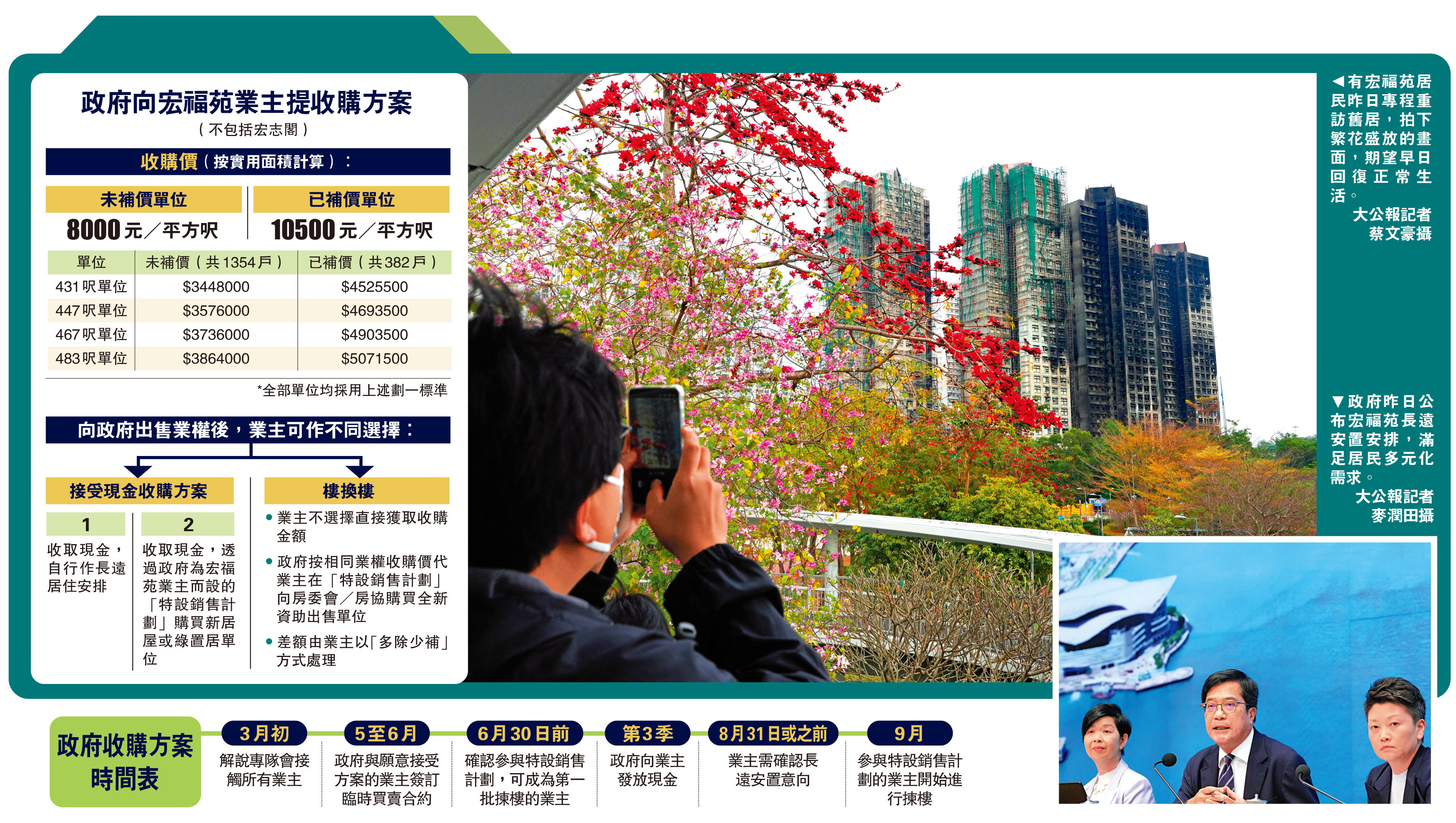 (大公報記者 易曉彤)特區政府就大埔宏福苑受影響居民的長遠安置方案昨日出爐,因應逾80%業主首要重視速度快,74%業主考慮接受政府收購業權,政府提出以溢價三成收購,實用面積收購呎價8000或10500元,每個單位收購價介乎344.8萬至507.15萬元,涉及總收購額達68億元,估計需動用約40億元公帑。政府並提供「特設銷售計劃」,出售業權的業主可收取現金或以「樓換樓」方式揀選房委會、房協的居屋或綠置居項目,涉及10個項目合共約3900個單位。