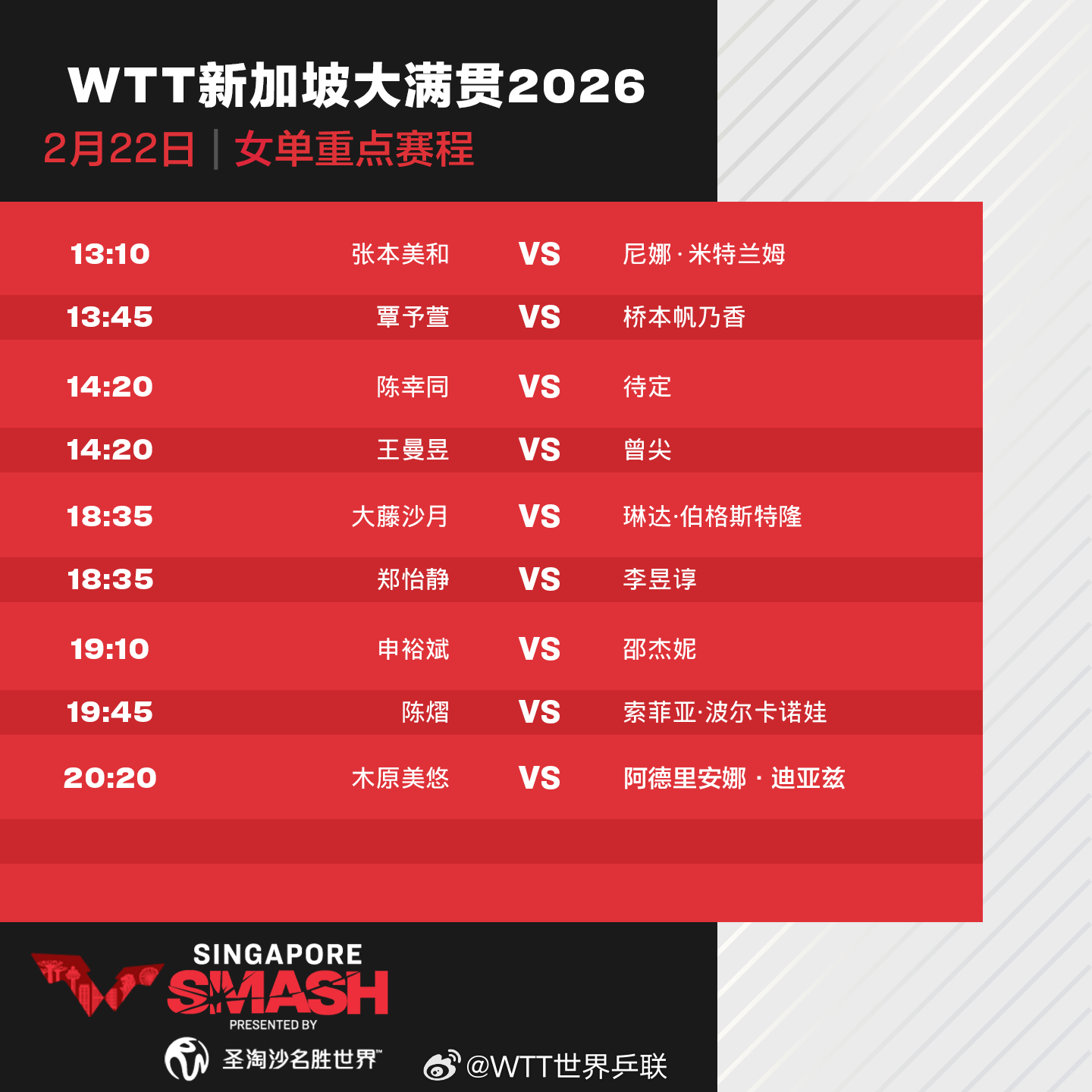 男單方面,王楚欽將迎戰澳大利亞選手盧偉,林詩棟則迎戰日本選手篠塚大登;女單方面,王曼昱將迎戰新加坡選手曾尖,新生代小將陳熠將迎戰奧地利老將索菲亞·波爾卡諾娃。