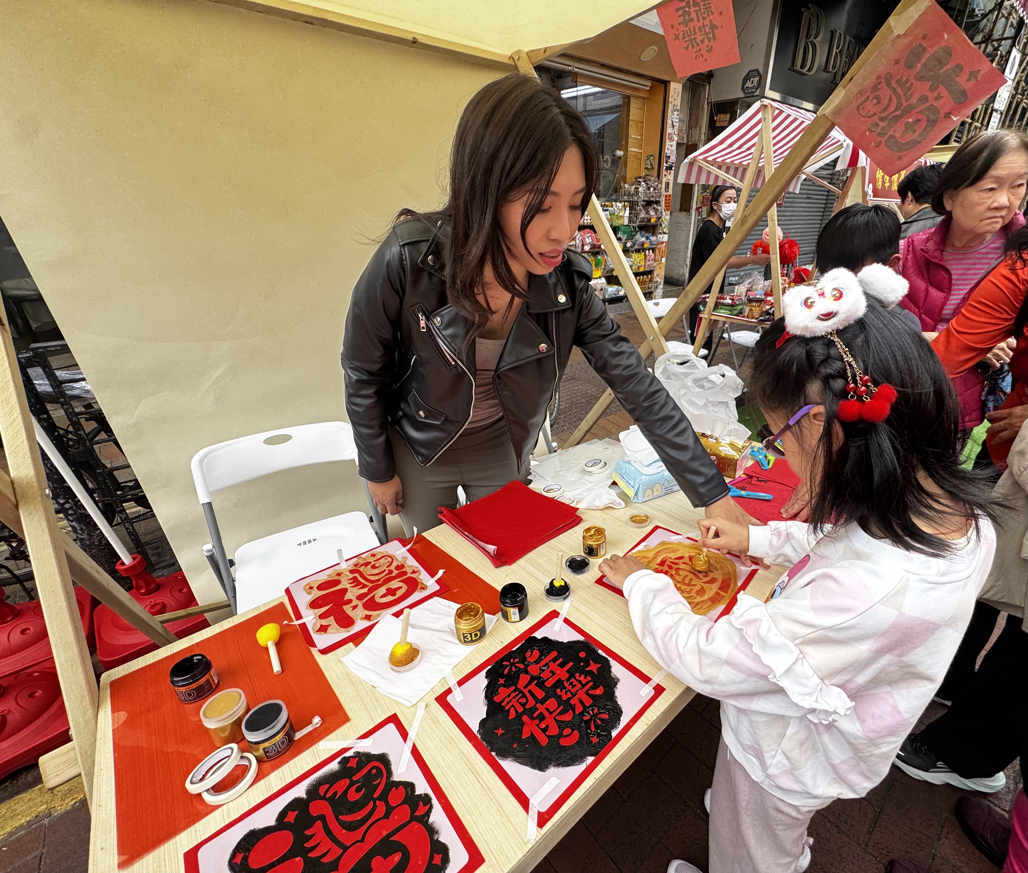 除了科普教育,現場亦有不少具年味的攤位。小朋友可以親自製作沙畫,完成後更可獲得一幅燙金門對,將新春祝福帶回家中。