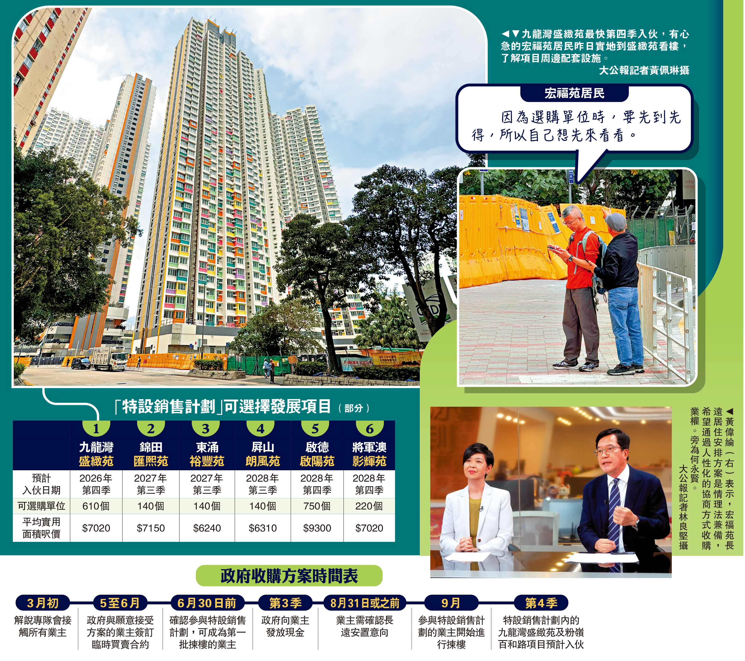 何永賢表示,8月31日是重要的時間節點,業主需於這日期之前明確表達意向。如果業主能在6月30日前確定向政府出售業權,可作為第一批優先選樓的業主,預期最快9月於「特設銷售計劃」揀樓,同一批次的業主會通過抽籤決定揀樓的先後次序。至於其他市民申請「居屋2025」的安排維持不變,即今年中申請,今年尾揀樓。