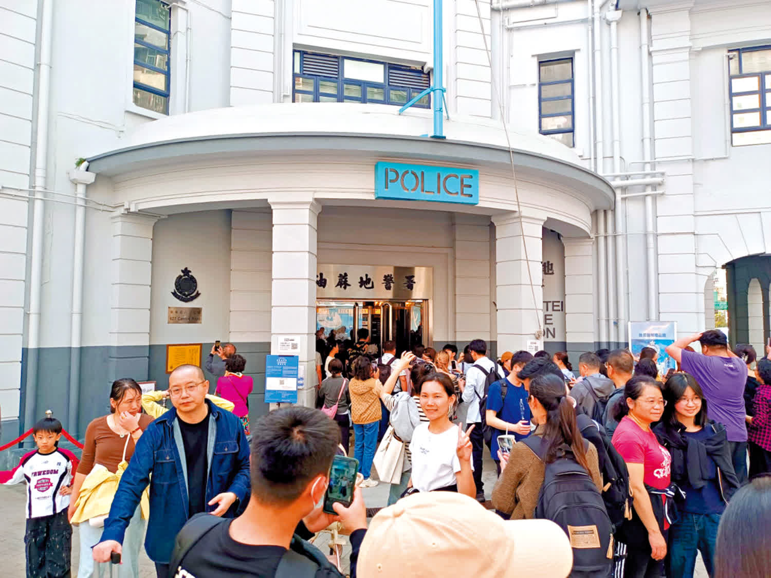 本港各旅遊熱點在新年期間大受旅客歡迎,其中油蔴地警署光影之旅展覽日日爆滿。大公報記者昨日在現場觀察,門口的旅客自發合照隊伍一度須等近半小時,禮品廊門口亦逾50人排隊等候入內,警察熊貓公仔、警徽磁貼等紀念品熱賣,暫時缺貨。