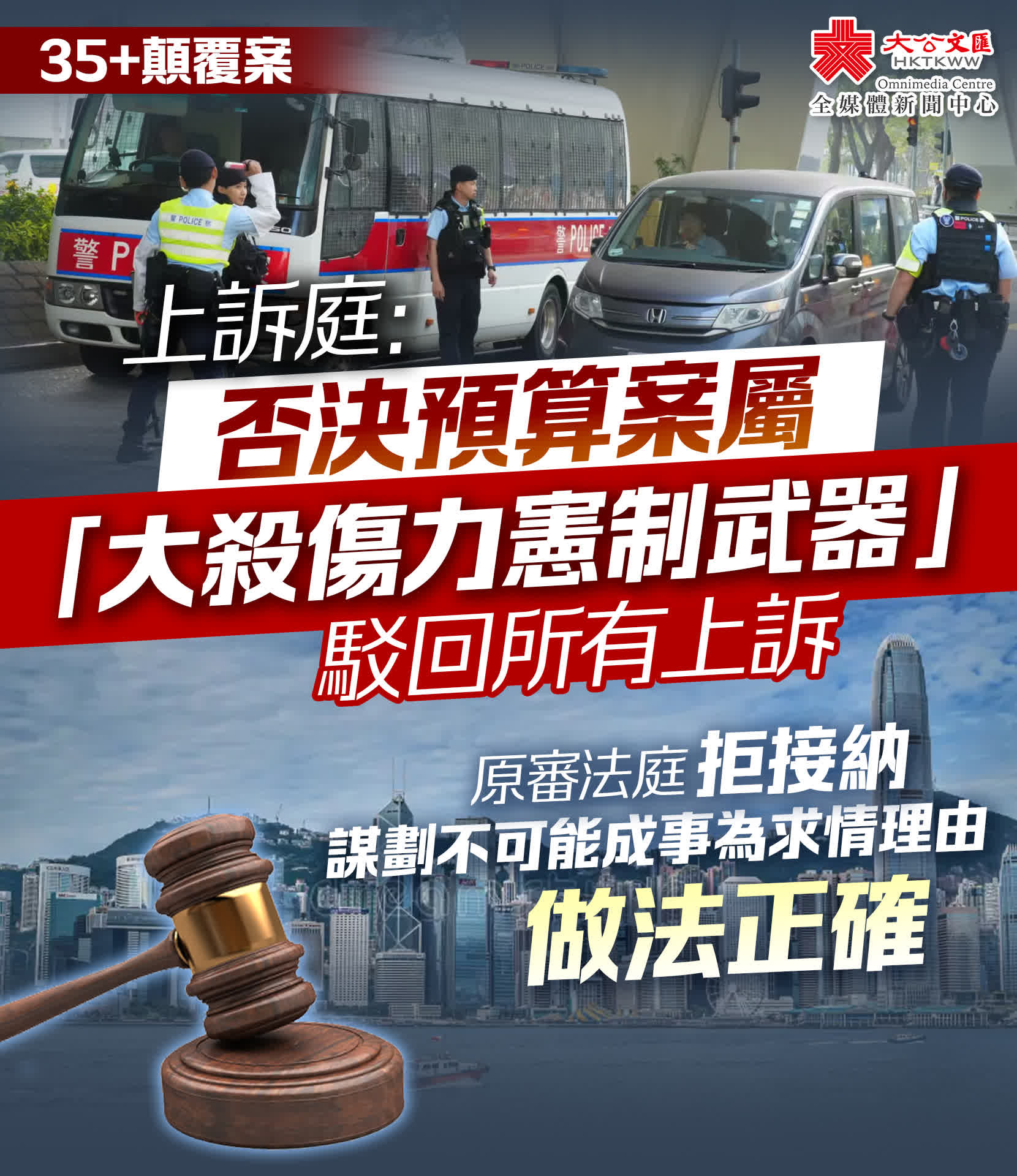 (大公文匯全媒體記者 蘇鉅祖)「35+串謀顛覆政權」案,45名被告早前被裁定串謀顛覆國家政權罪成,刑期從4年2個月到10年不等。其中12名被告提出上訴,而律政司就脫罪被告劉偉聰提出上訴,要求發還重審。高等法院上訴庭今日(23日)駁回所有上訴,維持原判。上訴庭在判案書中指出,原審法庭將量刑基準一律定為7年並非明顯過高。假如該謀劃涉及使用武力或威脅使用武力,量刑基準甚至可在7年以上。