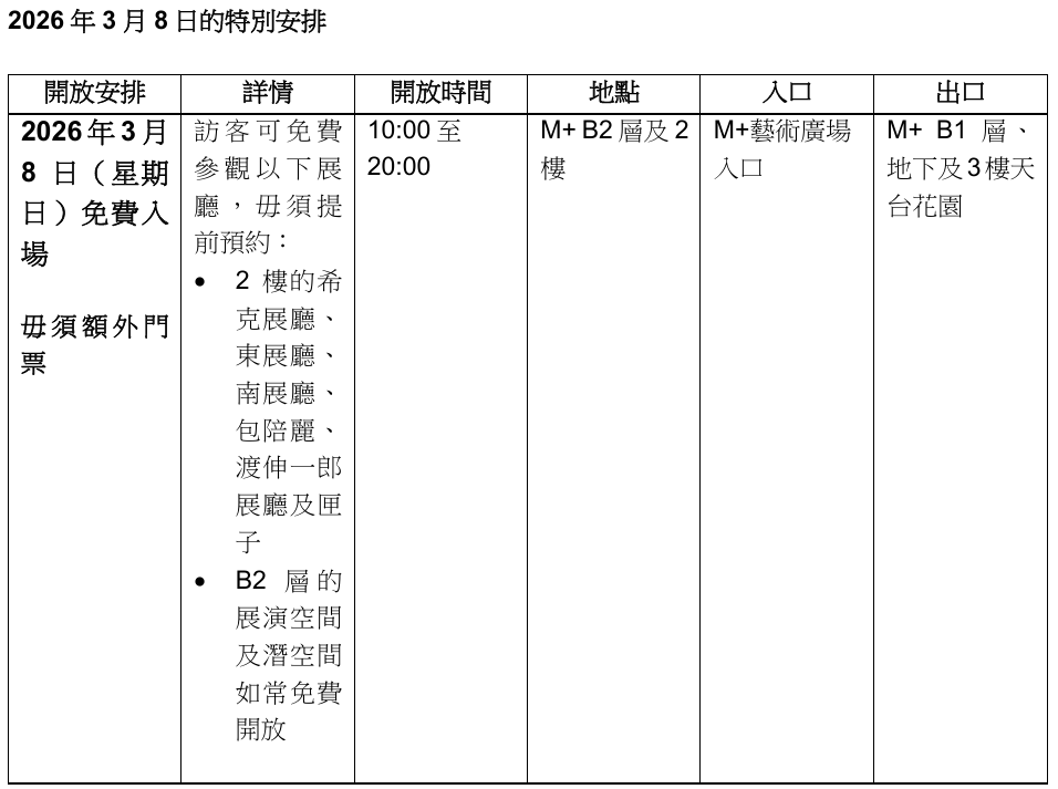 大公文匯全媒體報道,為慶祝「香港藝術三月」,位於西九文化區、亞洲全球性當代視覺文化博物館M+將於2026年3月8日(星期日)免費開放主要展覽及呈獻公眾節目(除地下大堂展廳的「趙無極:版藝匠心」外),毋須提前預約。
