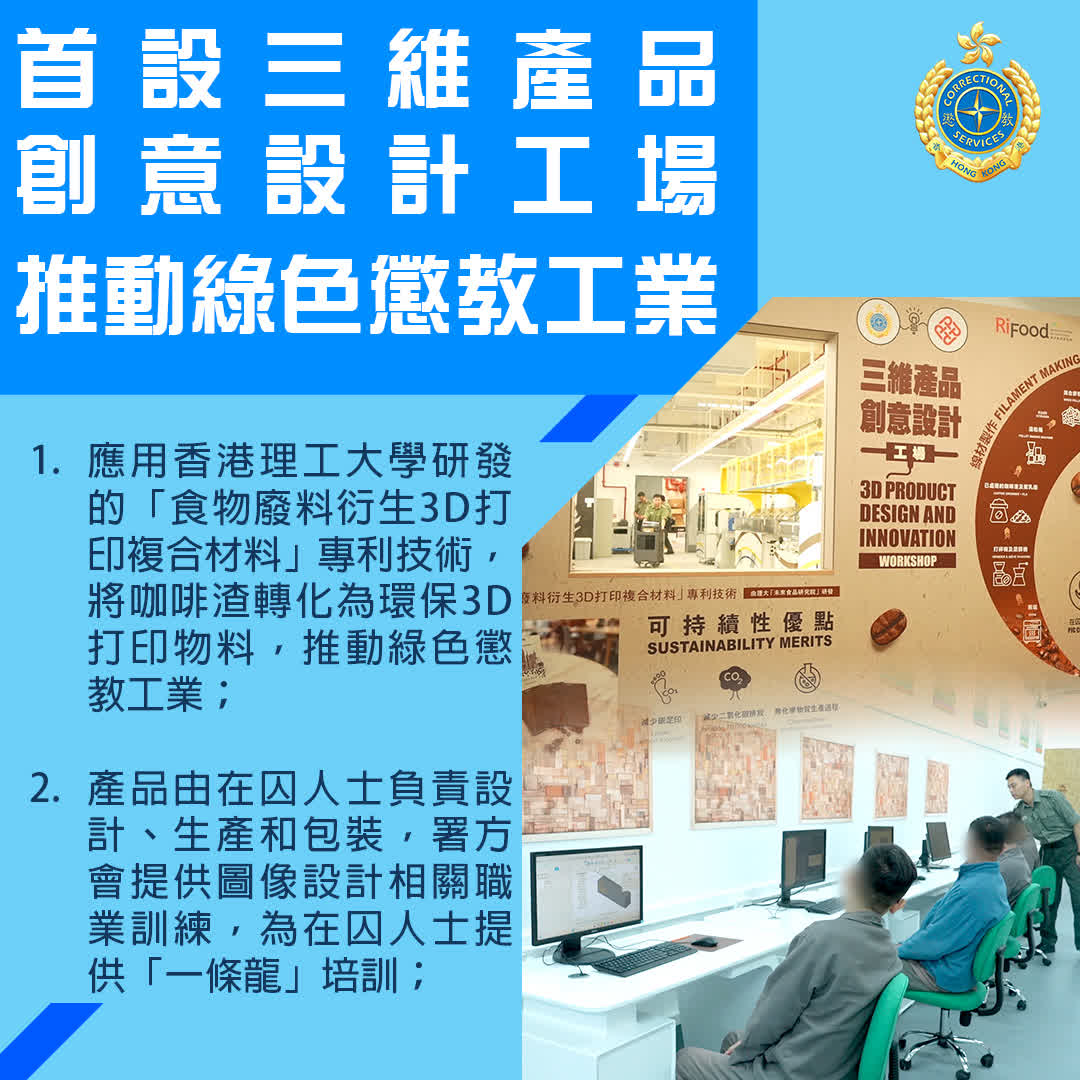 在懲教工業方面,署方在去年年初通過懲教署體育會開設「徵心製造」慈善網上禮品銷售平台,公開發售由在囚人士精心設計和製造的產品,並陸續增設多個線下銷售點。售賣「徵心製造」產品所得的款項在扣除必要開支後,將全數捐贈予不同的本地註冊慈善機構,為在囚人士提供回饋社會的機會,造福本地慈善事業。此外,「徵心製造」的發展有助在囚人士培養創意設計、品牌管理及市場營銷等增值技術,尤其是署方於去年二月與香港理工大學(理大)簽署合作備忘錄後,成功引入理大專利的「咖啡渣轉化為3D打印物料」技術,並在赤柱監獄拓展相關的「三維打印物料工場」,生產多款以咖啡渣升級物料為材料的限定產品,這不僅為「徵心製造」注入更多環保創新元素,還讓在囚人士學習到更多新技能、新產業知識。