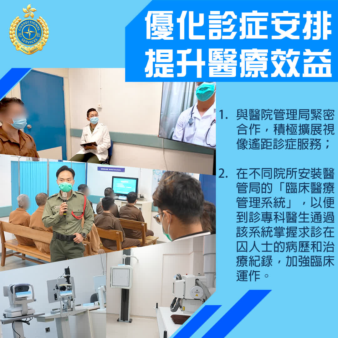 在囚人士的健康護理服務方面,懲教署與醫院管理局(醫管局)保持緊密合作,積極擴展視像遙距診症服務。截至二○二五年,精神科視像遙距診症服務已涵蓋16間公立醫院和診所,而內科視像遙距診症服務亦涵蓋七間公立醫院。有關服務亦已擴展至骨科,當中包括屯門醫院、伊利沙伯醫院、明愛醫院及瑪麗醫院。二○二五年,署方合共安排1 134在囚人次接受視像遙距診症服務,較去年693在囚人次上升63.6%。此外,署方與醫管局持續優化到診專科門診服務,在不同懲教院所安裝醫管局的臨床醫療管理系統,以便醫管局到診專科醫生通過該電子平台掌握求診在囚人士的病歷和治療紀錄,以加強到診專科醫生在懲教院所內的臨床運作,進一步提升在囚人士的醫療護理服務水平。