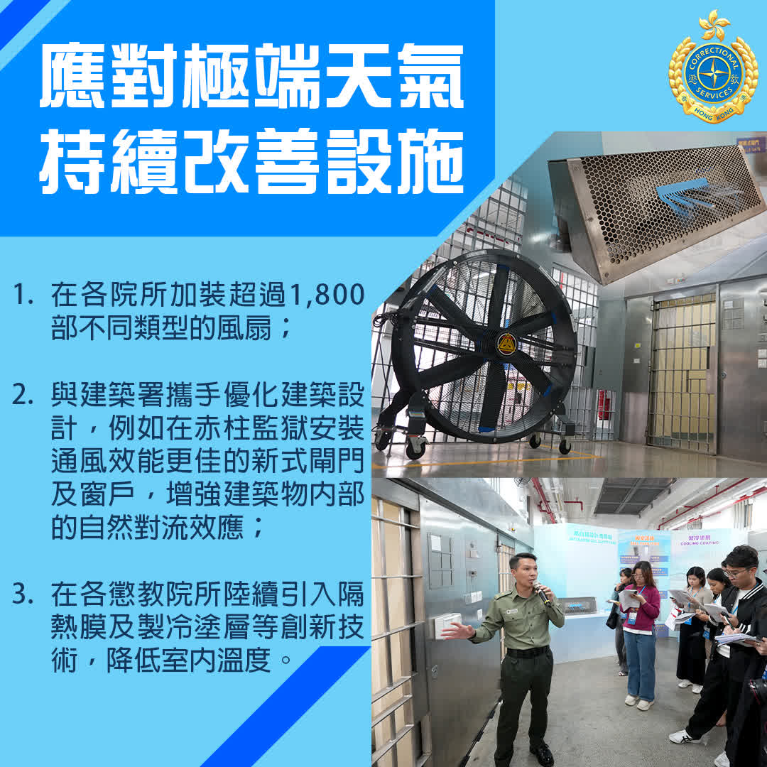 為應對酷熱天氣,署方在二○二五年持續進行改善設施的工程,提升懲教院所內的空氣流通。去年,各院所合共更換或加裝超過1 800部不同類型的風扇,包括增設大型座地工業扇,令各院所的風扇總數增至逾17 500部。署方亦繼續積極與建築署攜手優化建築設計,例如在赤柱監獄安裝通風效能更佳的新式閘門及窗戶,有效增強建築物內部的自然對流效應。此外,各懲教院所陸續引入隔熱膜及製冷塗層等創新技術,以降低室內溫度,相關技術已分別應用於21間及六間懲教院所。