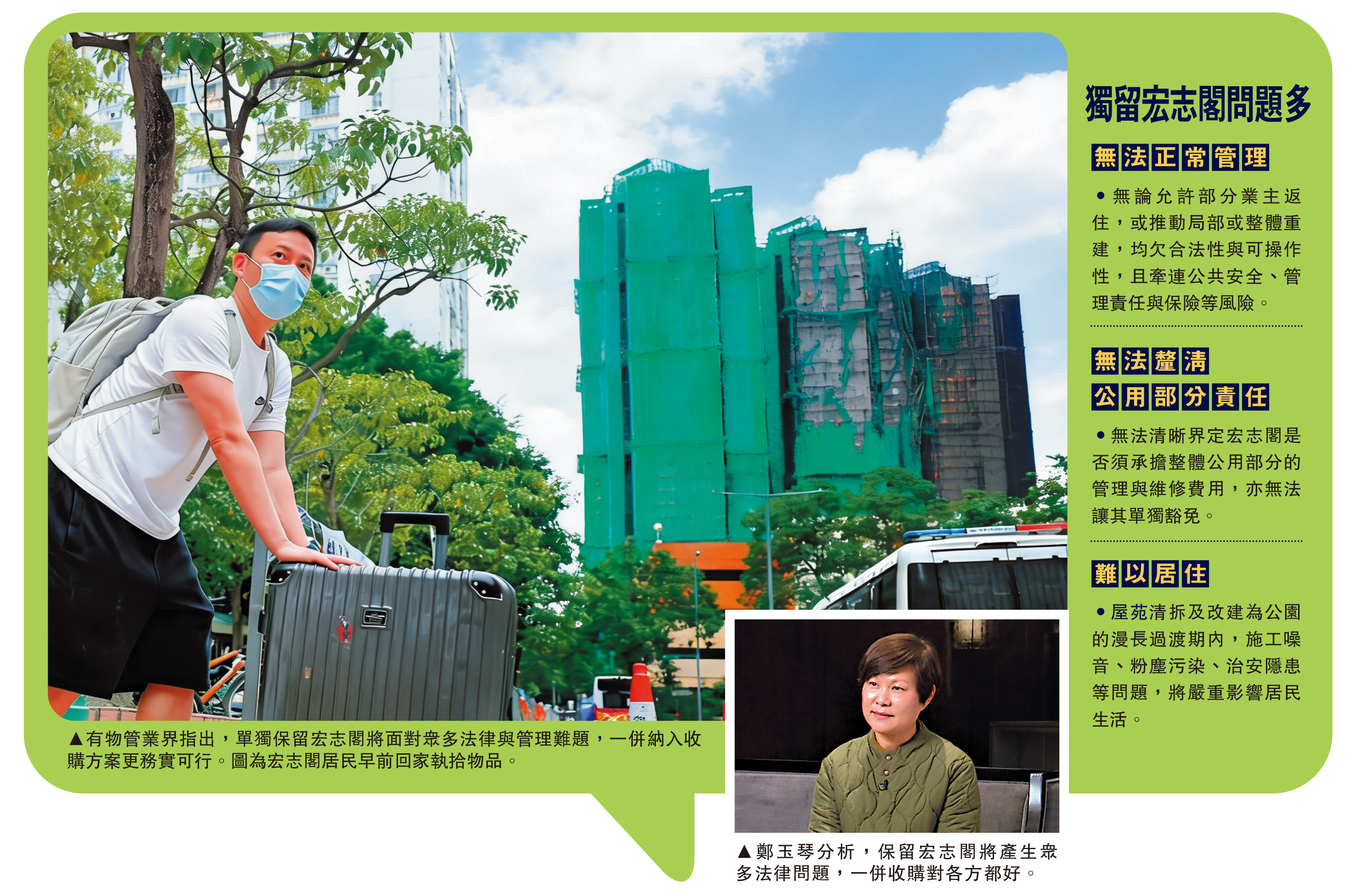 至於宏志閣能否獨立處理管理與居住,鄭玉琴認為亦屬法律困境。宏志閣雖未受損,仍屬宏福苑單一地契及統一大廈公契範圍,公用部分、土地權益與管理責任不可分割。現行法例與公契下,既無法清晰界定宏志閣是否須承擔整體公用部分的管理與維修費用,亦無法讓其單獨豁免。即便允許繼續居住,亦無法解決公用部分責任與管理權歸屬等核心問題。