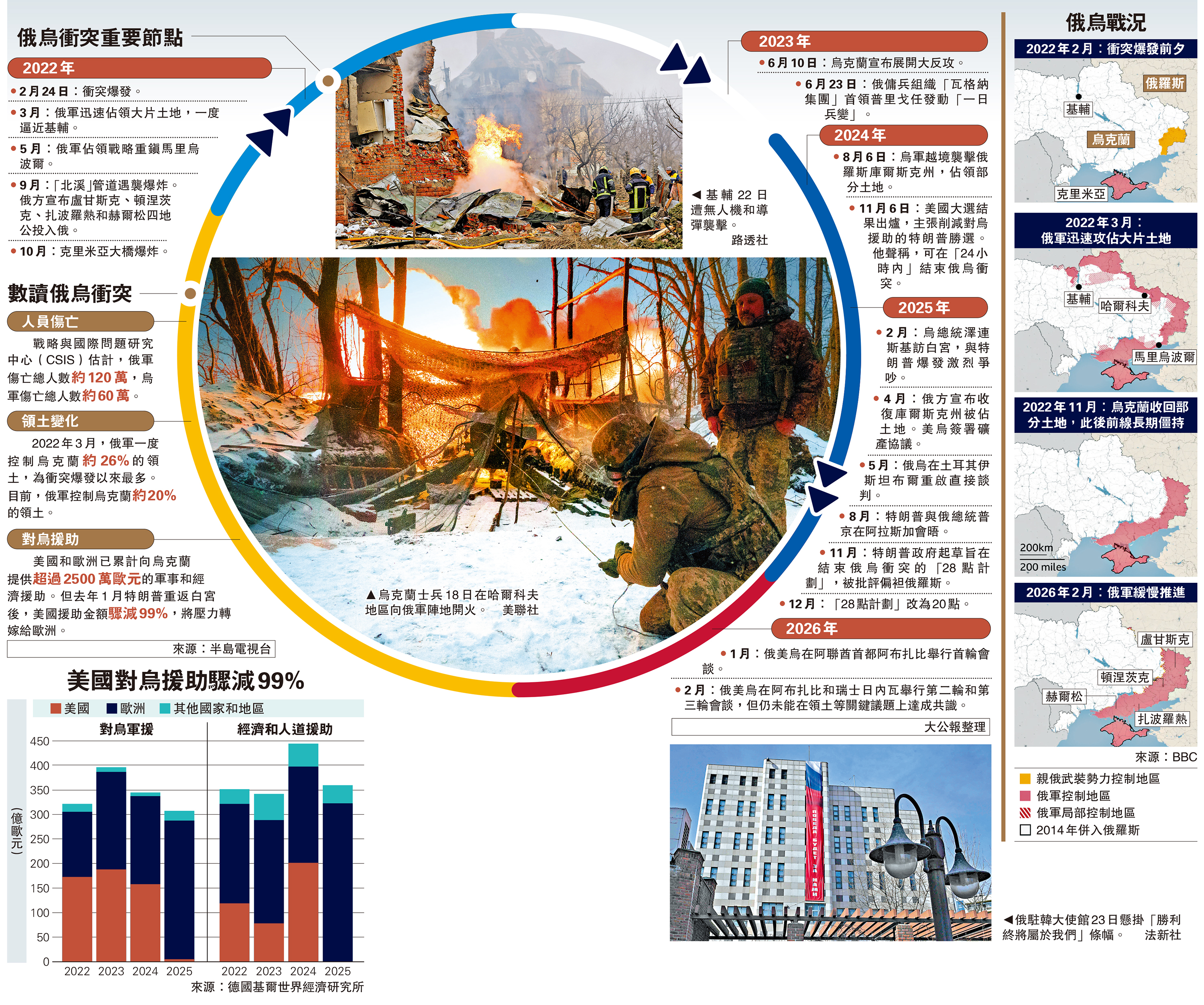 大公報綜合報道,距離2022年2月24日俄烏衝突爆發,已過去整整四年時間,但俄烏雙方在軍事和外交方面都陷入了僵局。23日,烏軍對俄羅斯邊境地區發動導彈襲擊,造成供電及供水中斷;俄軍則空襲扎波羅熱和敖德薩等地。烏總統澤連斯基指責俄總統普京「發動第三次世界大戰」,並呼籲美歐等「國際夥伴」提供更多支持。然而,美國總統特朗普重返白宮後,美國對烏援助驟減99%。今年以來,俄美烏已舉行三輪會談,始終未能就領土等關鍵議題達成共識。烏方稱,新一輪談判最快本周舉行。
