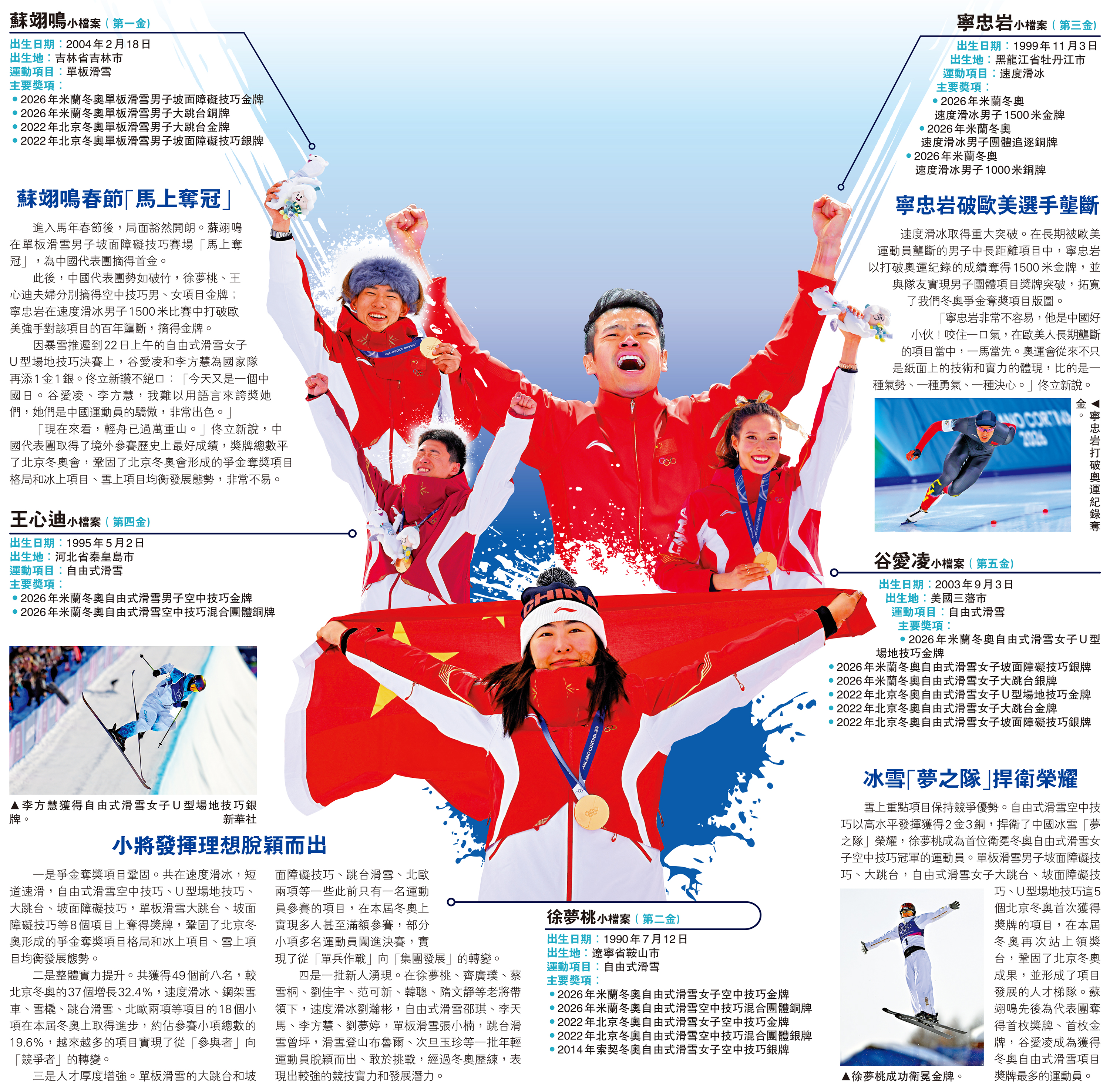 雪上重點項目保持競爭優勢。自由式滑雪空中技巧以高水平發揮獲得2金3銅,捍衛了中國冰雪「夢之隊」榮耀,徐夢桃成為首位衛冕冬奧自由式滑雪女子空中技巧冠軍的運動員。單板滑雪男子坡面障礙技巧、大跳台,自由式滑雪女子大跳台、坡面障礙技巧、U型場地技巧這5個北京冬奧首次獲得獎牌的項目,在本屆冬奧再次站上領獎台,鞏固了北京冬奧成果,並形成了項目發展的人才梯隊。蘇翊鳴先後為代表團奪得首枚獎牌、首枚金牌,谷愛凌成為獲得冬奧自由式滑雪項目獎牌最多的運動員。