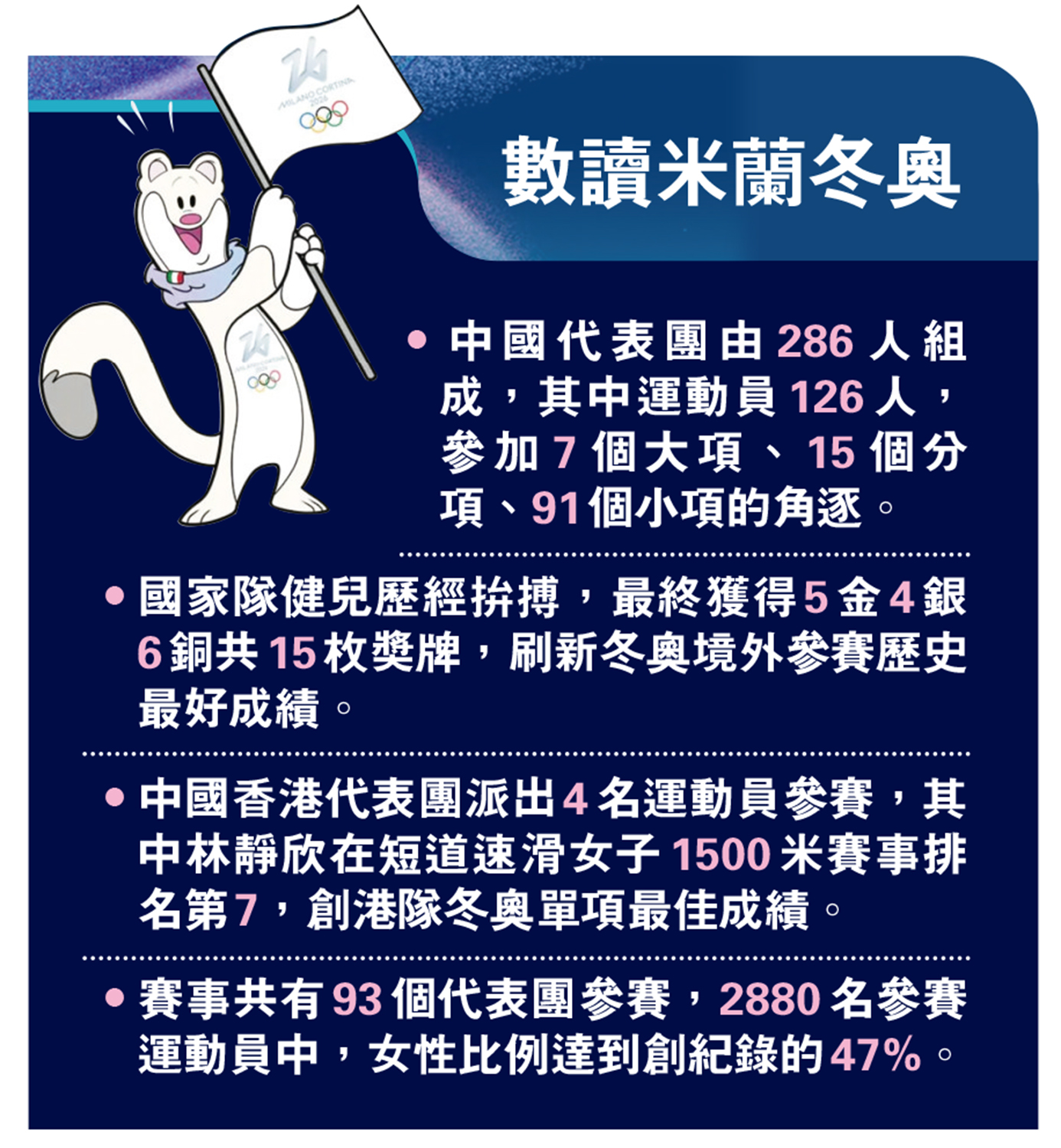 大公報援引新華社報道,米蘭冬奧會閉幕之日,中國體育代表團以5金4銀6銅、共15枚獎牌的成績,創造冬奧境外參賽歷史最好成績。回首半個多月來的激烈角逐,中國代表團副團長佟立新22日在意大利利維尼奧接受記者採訪時,用「山重水復疑無路,柳暗花明又一村」形容這次征程。