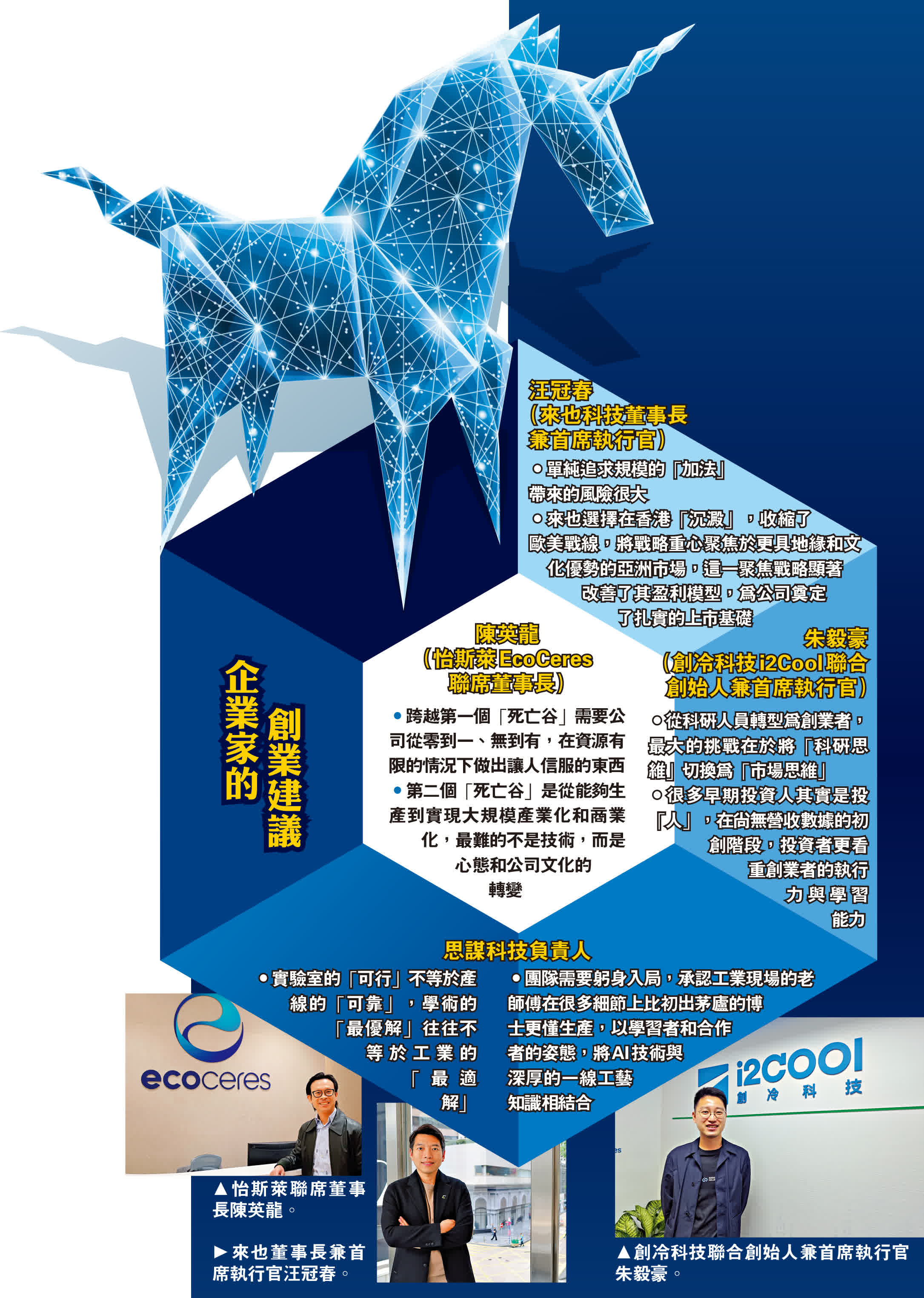 (大公報 記者 李樂兒、毛麗娟)隨着創科政策日臻完善、投資氛圍越發活躍、人才持續匯聚,香港創科發展正式邁入黃金時代,企業紛紛選址香港,加速布局。然而,從靈光一現到成為獨角獸企業,被許多創業者形容為一場不斷跨越「死亡谷」的跋涉。其中,最關鍵的兩次跨越,並非僅僅關乎資金或技術,而是一場從創始人到團隊都必須經歷的思維跳躍。本地可再生燃料公司怡斯萊(EcoCeres)與來也科技,一家已成為盈利的行業巨頭,一家正邁向上市的成長先鋒,他們的成長路徑詮釋了「從加法到減法」如何決定企業的生死與高度。