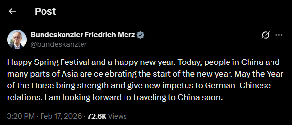 此前,默茨已在多個場合「預熱」。當地時間17日,默茨在社交媒體上發帖:「祝大家春節快樂,新年快樂!今天,中國和亞洲許多地區的人們都在慶祝新年的到來。願馬年為德中關係帶來力量和新的動力。我期待着不久的將來訪問中國。」