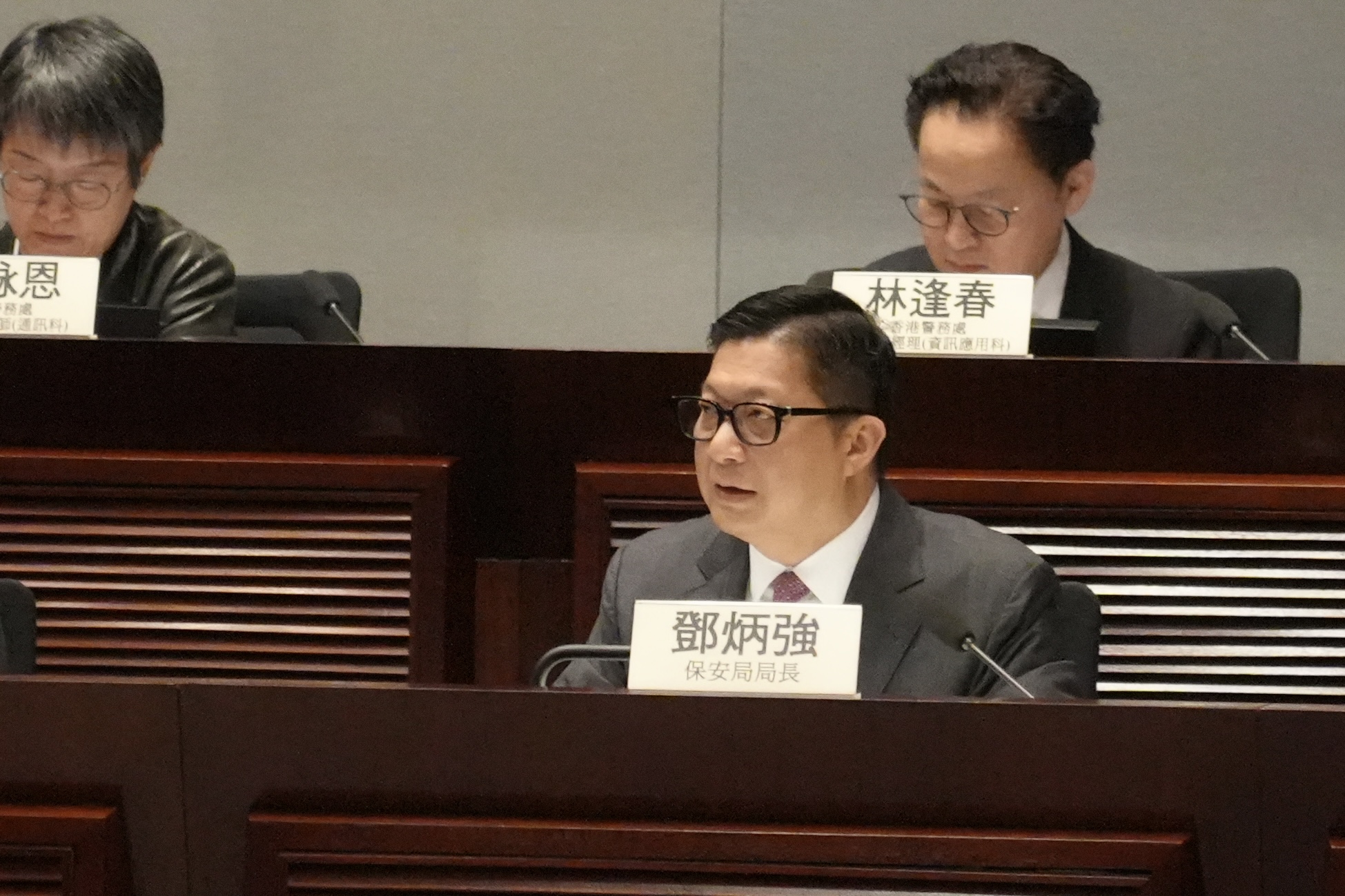 立法會議員陳學鋒詢問「銳眼計劃」技術問題。他指,「銳眼計劃」在輔助警方執法時,是否需另行立法,以標示哪些鏡頭有執法功能;及日後「銳眼計劃」的鏡頭維修責任歸誰。鄧炳強回應,「銳眼計劃」在輔助執法時確需另行立法,惟執法非該計劃的目的,而是防止罪案及防止道路堵塞。他續指,「銳眼計劃」未來將接入更多政府部門及公共機構的閉路電視系統,例如隧道、公共屋邨的公用地方、康體場所、機場及邊境管制站等,維修保養屬第三方責任。