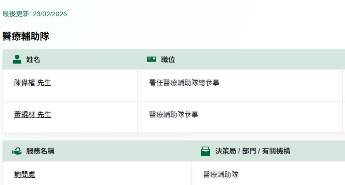 根據資料,黃英強於1997年加入消防處任職救護主任,2019年6月15日起出任醫療輔助隊總參事。今日(24日)翻查政府電話簿網頁,醫療輔助隊總參事職位已由副總監陳偉權署任。