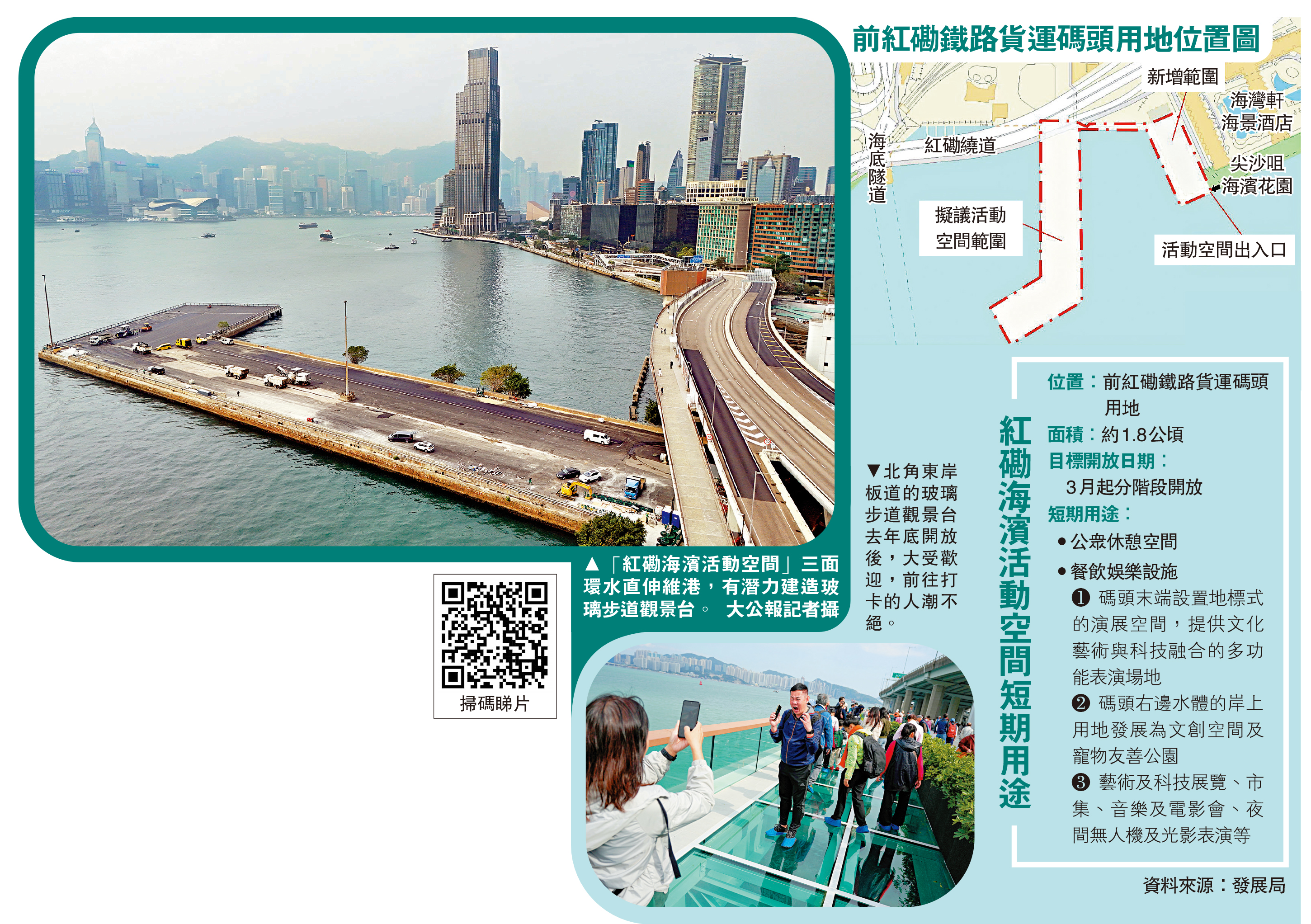 (大公報記者 梁少儀 黃佩琳)維港海濱將於今年內再陸續開放三個地段,其中位於前紅磡鐵路貨運碼頭的「紅磡海濱活動空間」,可望於下月起分階段開放給公眾使用,營運期為三年,打造為融合多元體驗的綜合性維港新景點。
