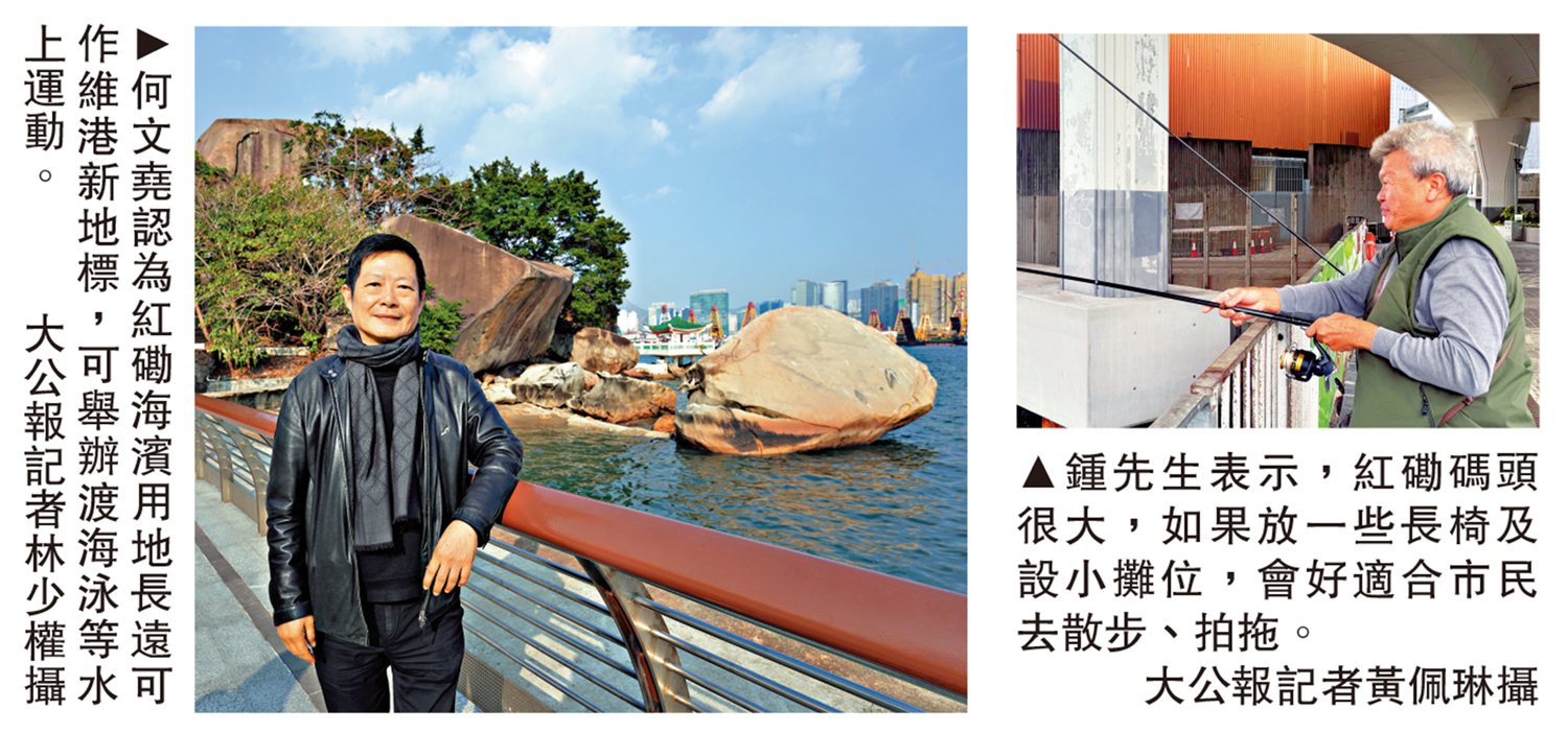 在紅磡碼頭附近一帶,經常有市民在海邊釣魚。市民鍾先生說釣魚幾十年,走遍香港每個區,他十分期待「紅磡海濱活動空間」開放,可以解鎖釣魚新地點:「那裏地方很大,又凸出到海,肯定能釣更多魚啦!而且如果放一點長椅、攤位,好適合大家去散步、拍拖,肯定好受歡迎。」