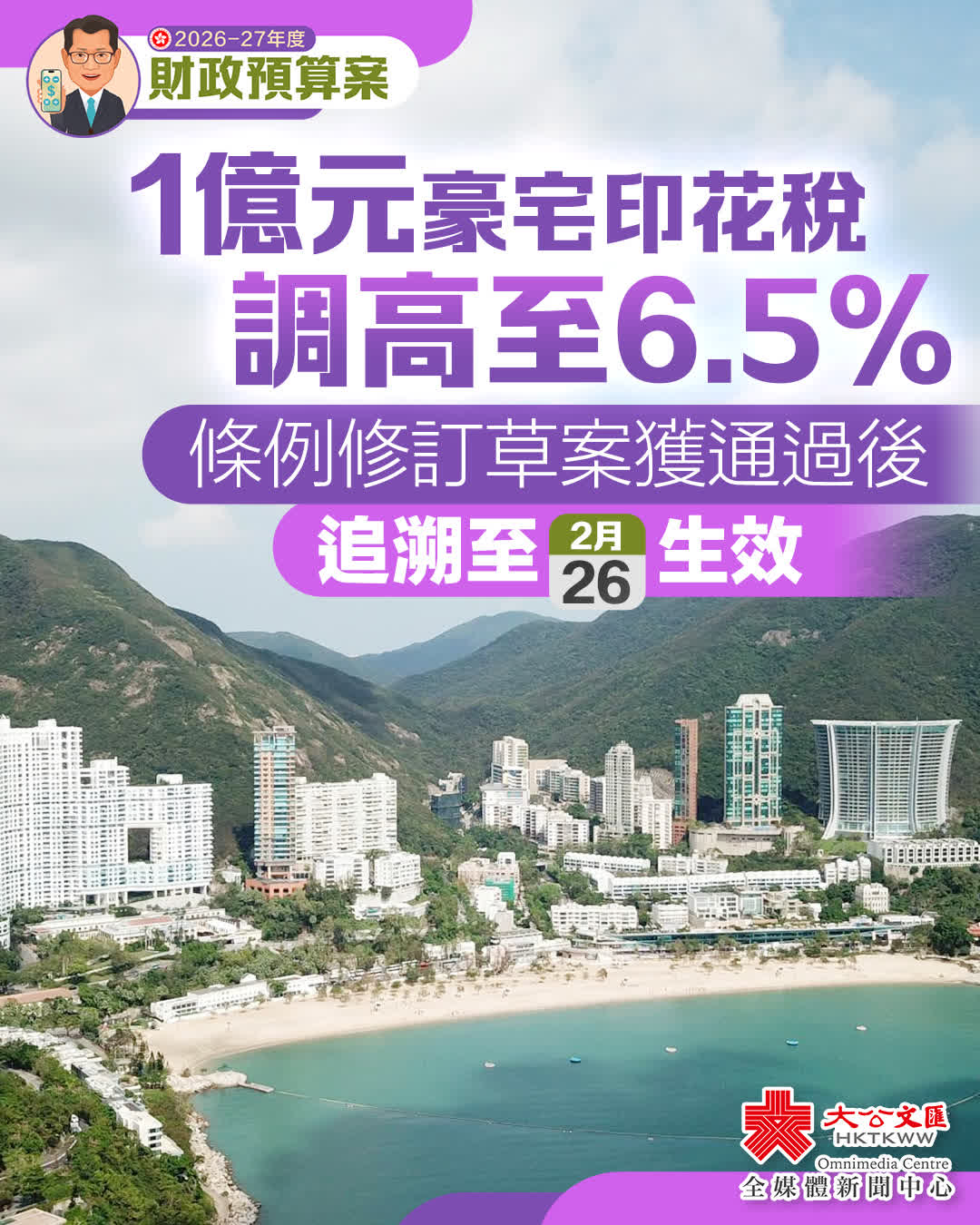 大公文匯全媒體報道,財政司司長陳茂波今早(25日)到立法會發表新一份財政預算案。陳茂波表示,在開源方面,秉持「能者多付」的原則,1億元以上的住宅物業交易印花稅稅率,將由4.25%調高至6.5%,影響約0.3%的住宅物業交易,估計每年可增加約10億元收入。措施將於條例修訂草案獲通過後,追溯至明日(26日)開始生效。