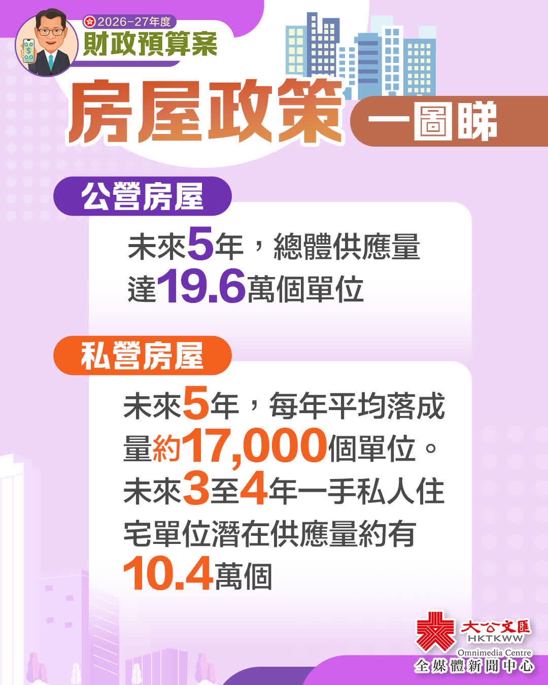 去年《施政報告》宣布的主要政策措施,共涉及74億元經營開支、320億元非經營開支及200億元財務承擔,另外,亦會減少約13億元收入。相關措施的財務影響已在2026/27年度財政預算反映。