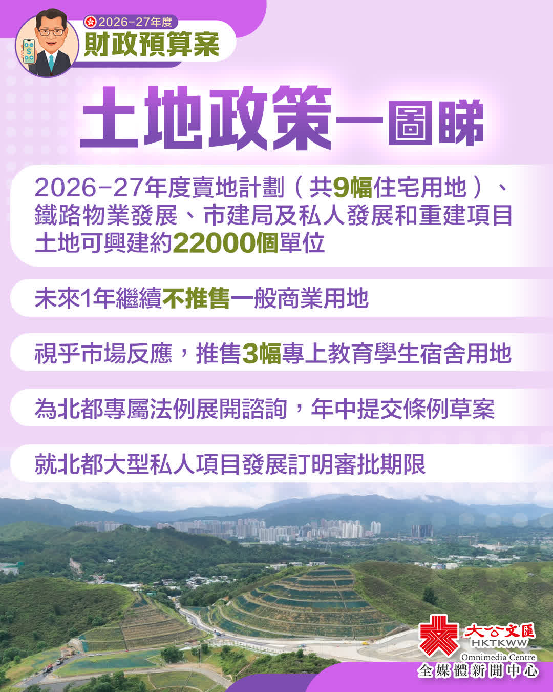 (五) 提速推進北都發展:北都是香港未來發展的新引擎,將為香港注入新經濟動力,助力香港「南金融、北創科」的新產業佈局。我們正提速推進北都發展,包括採用「片區」模式批地和加快引入企業及產業;成立兩間專屬公司,分別聚焦新田科技城及洪水橋產業園;預計在年中提交北都專屬法例的條例草案。