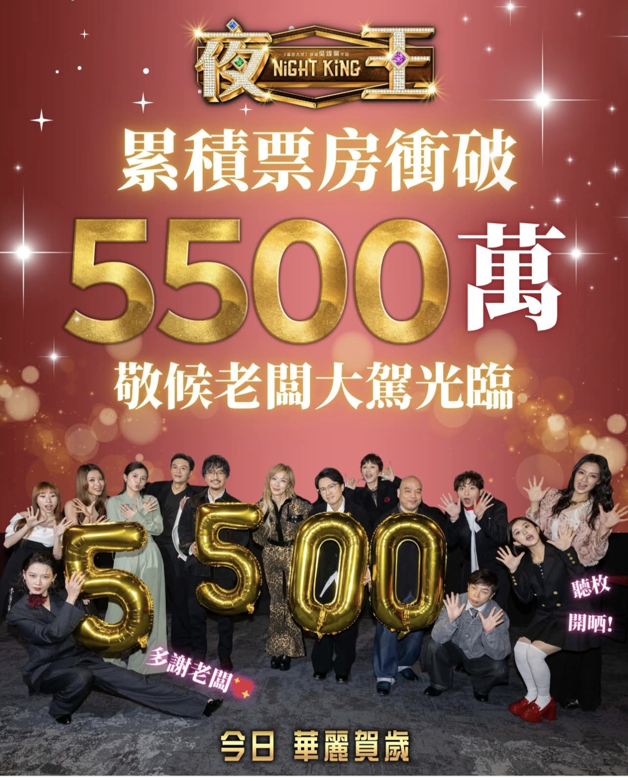 大公文匯全媒體報道,黃子華、鄭秀文領銜主演的賀歲片《夜王》票房再報捷,截至今(25日)早累積票房已衝破5500萬,片方隨即在社交平台發文答謝觀眾支持,並以「多謝各位老闆,即送大果盤,散啲口碑出去靠大家嘞」等字句回應熱潮,同時呼籲觀眾繼續入場,「《夜王》,繼續戲院見」。據悉,雖然新春假期已完,《夜王》依然旺場,有某些戲院排片上全部是《夜王》。